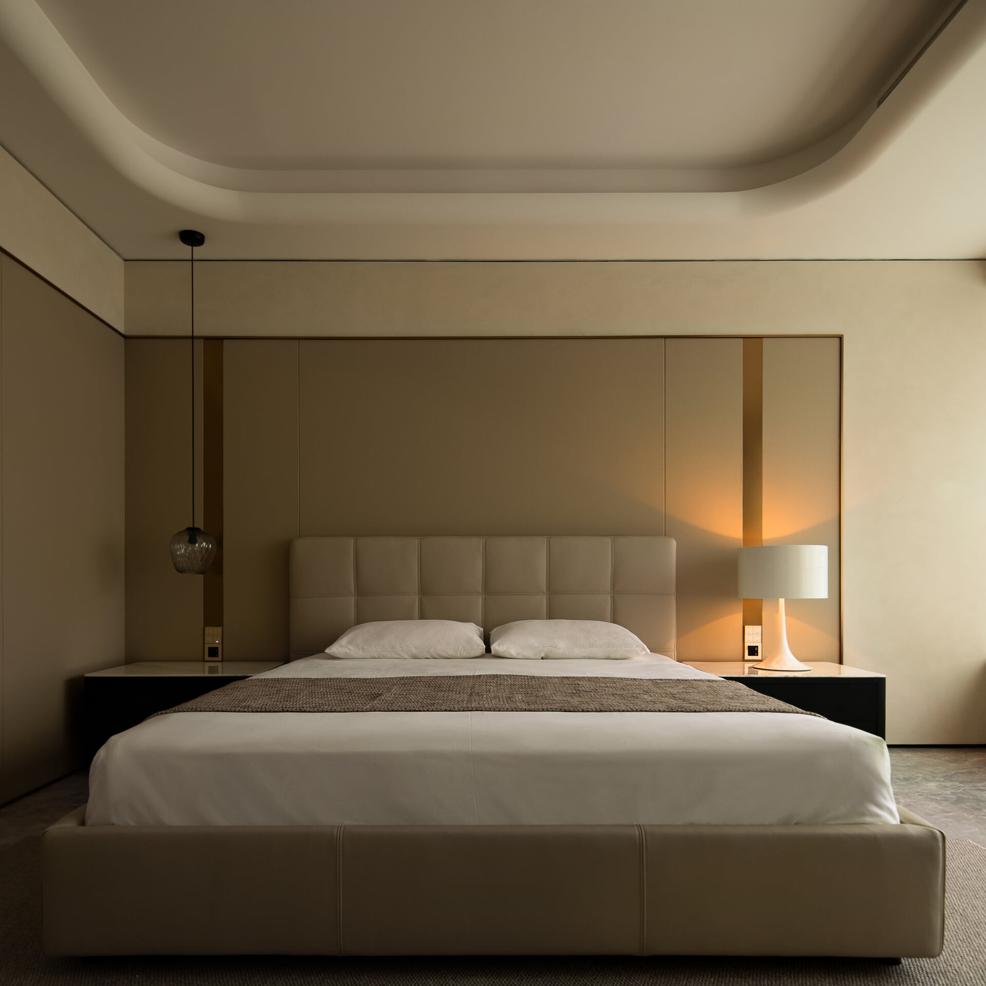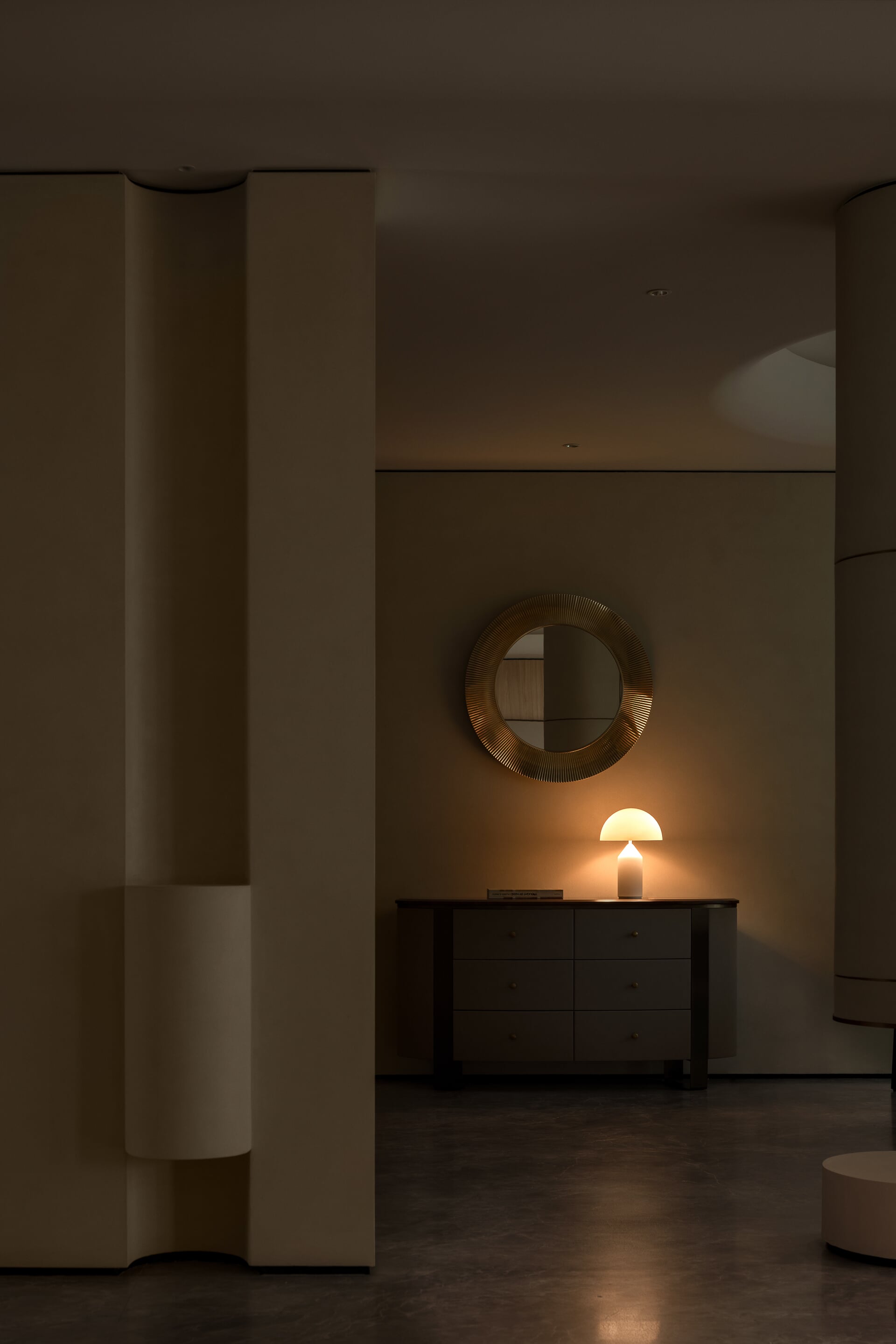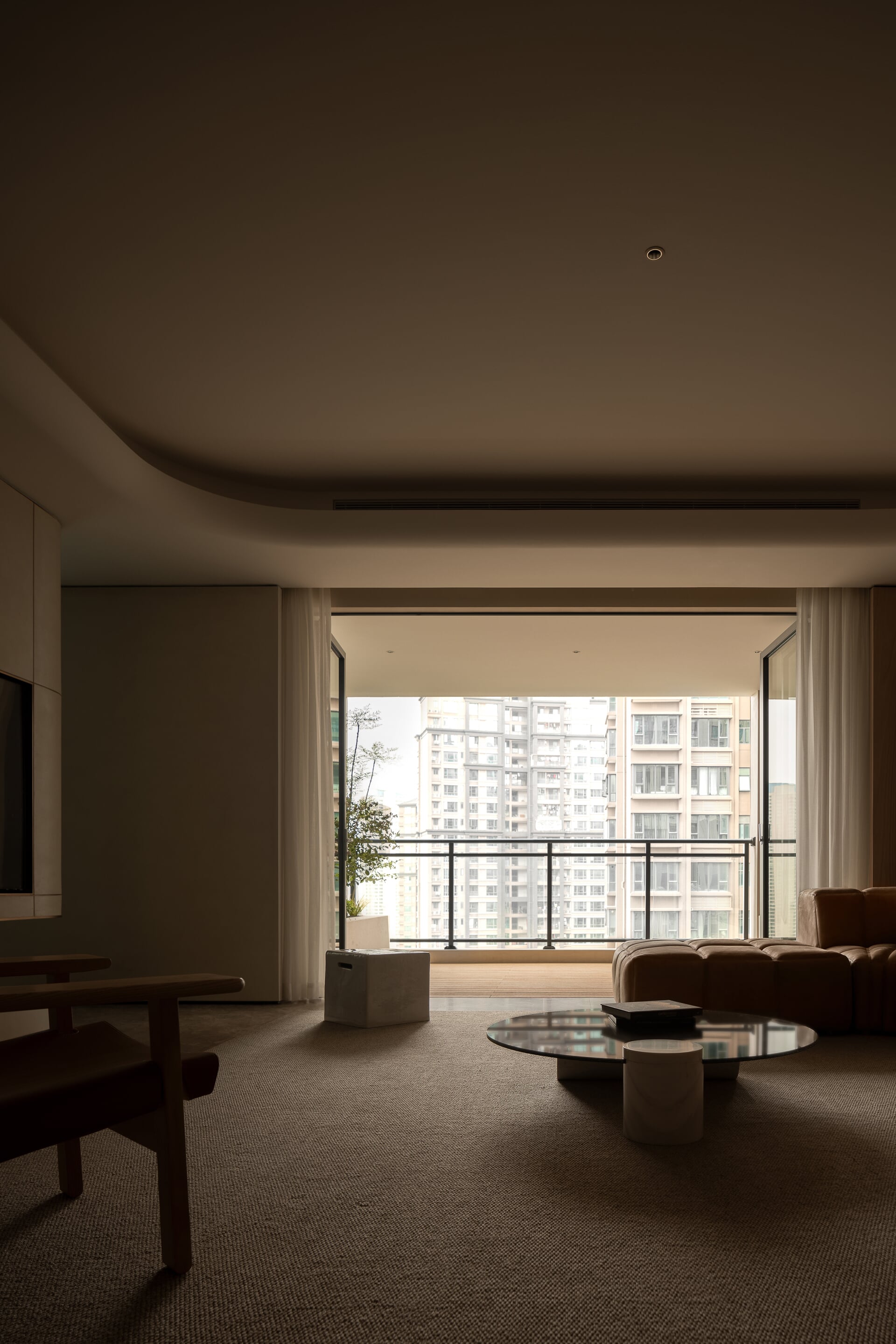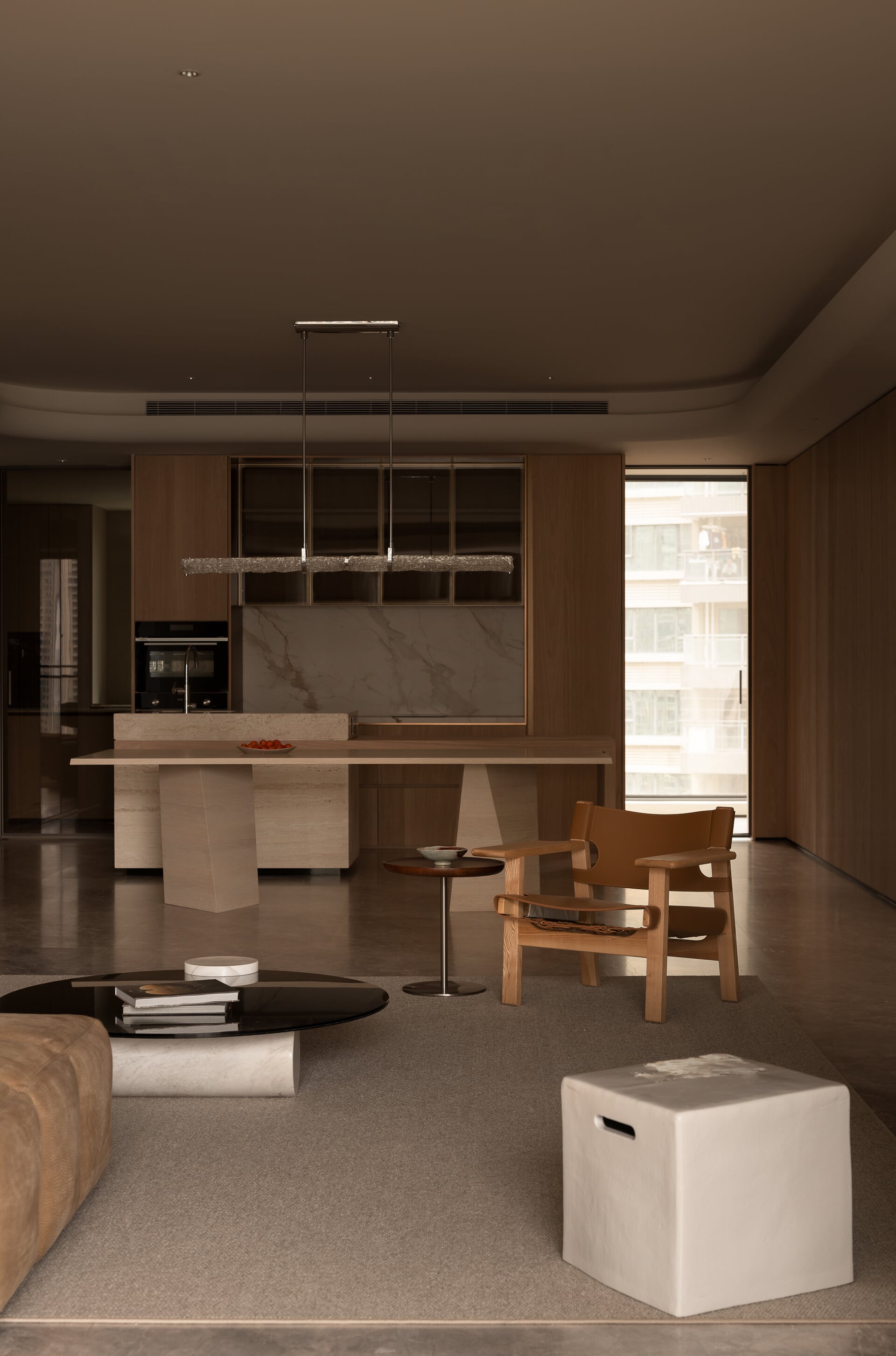 功能规划上对原户型存在的私密性弱,廊道过多等问题进行了优化,充分释放空气的流通性、合理提高自然采光和景观的利用率,以及通过三重中轴玄关大幅提升空间体验的仪式感和品质感。美学形式叠合功能,以暖系基调叠合自然肌理,拼接利落线条,简饰意奢元素建构空间,使之呈现出一种持守风雅、尺度、审慎连接的品质生活型格。