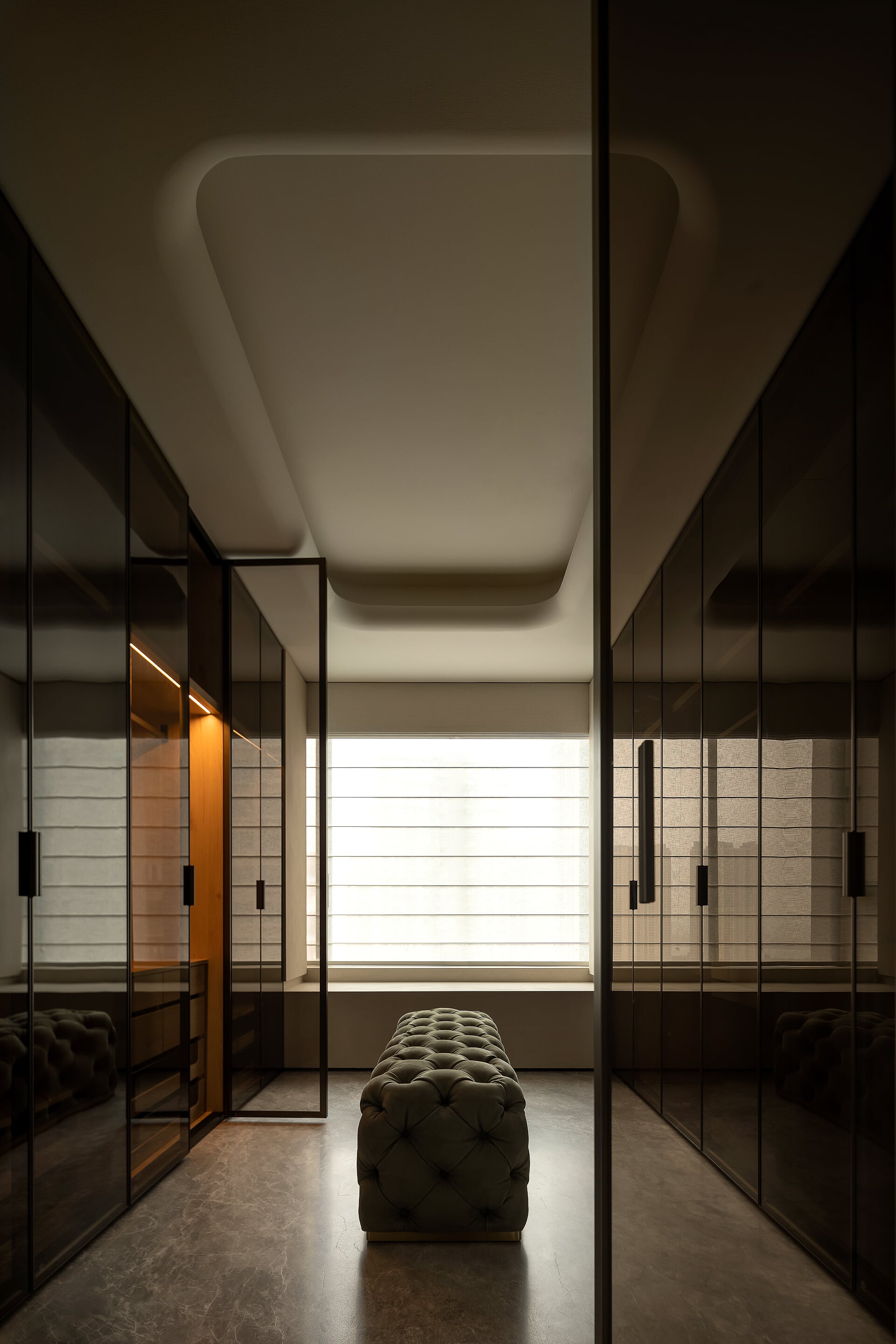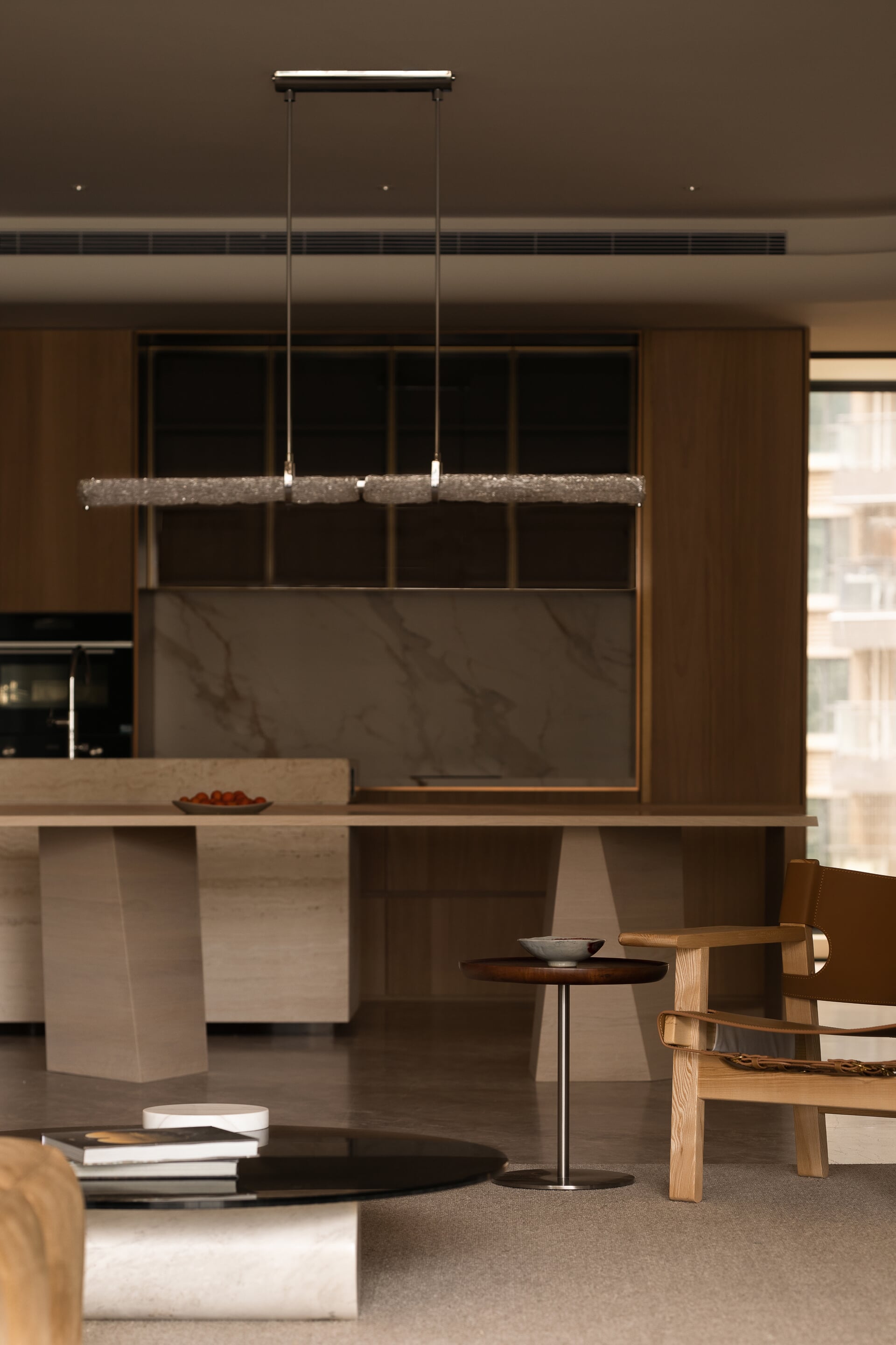 设计师将整体空间设计为动静两区。动态区域由双梯入户且带有衣帽间的玄关、中西双岛台厨餐区、一体两面的墙柜自然分置的客娱区、以及可开合自如的双露台组成,主要满足生活日常和社交。静态区域则由男女主人收纳服饰的衣帽间,连通江景主卧、功能完备的主卫以及不扰休息的办公区,四区合一,形成服务于主人休憩、互动、处理工作等情感生活需求的套间。