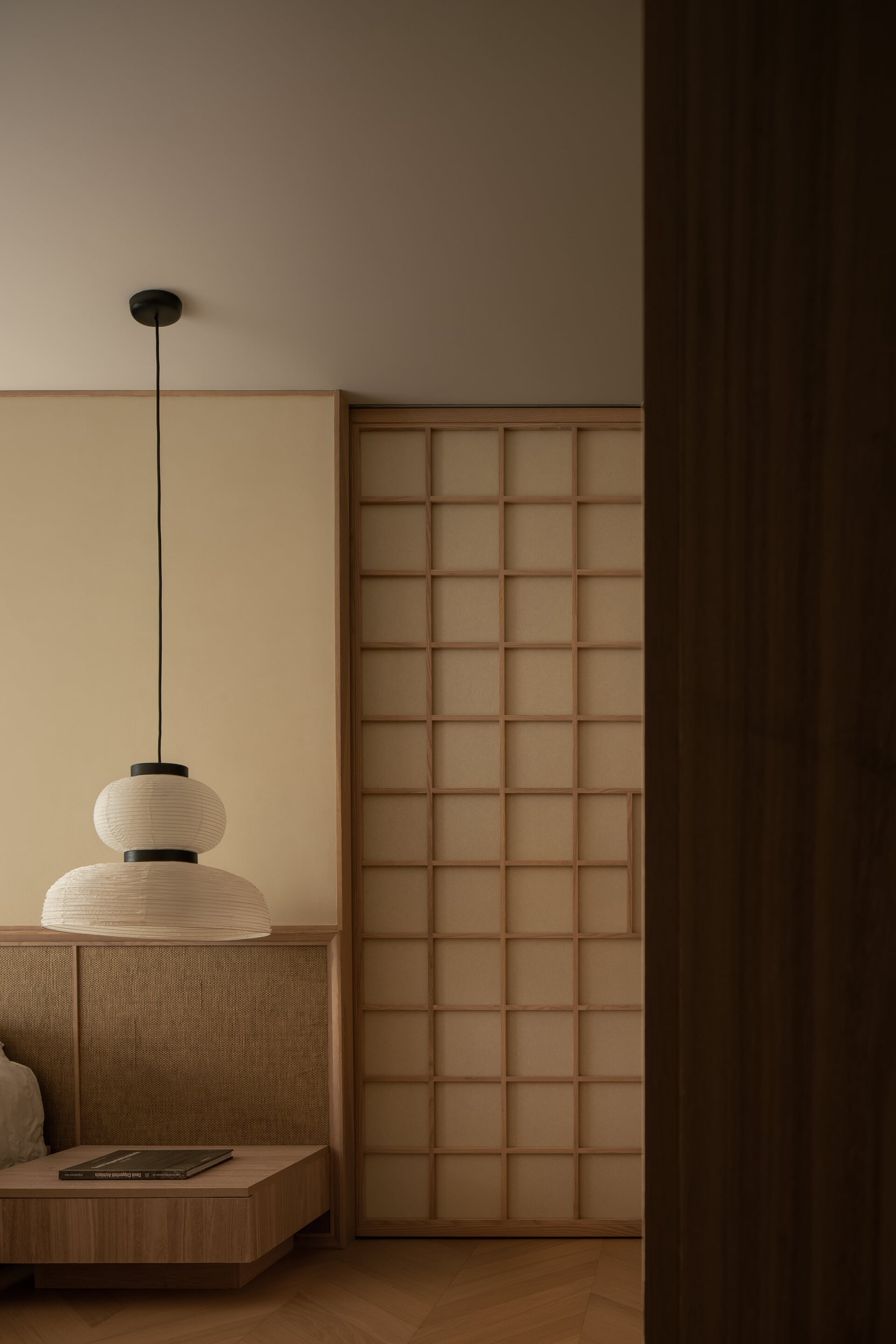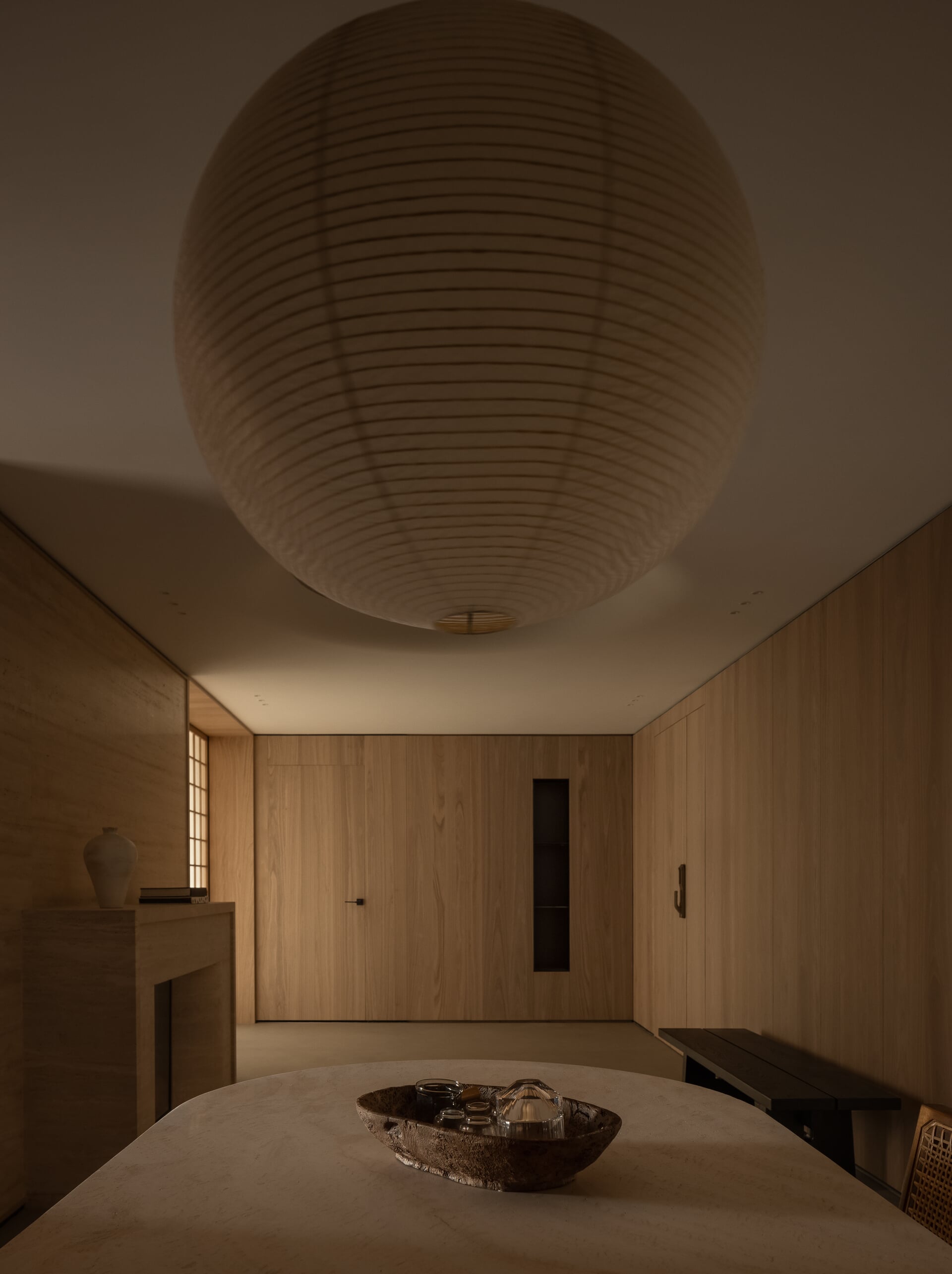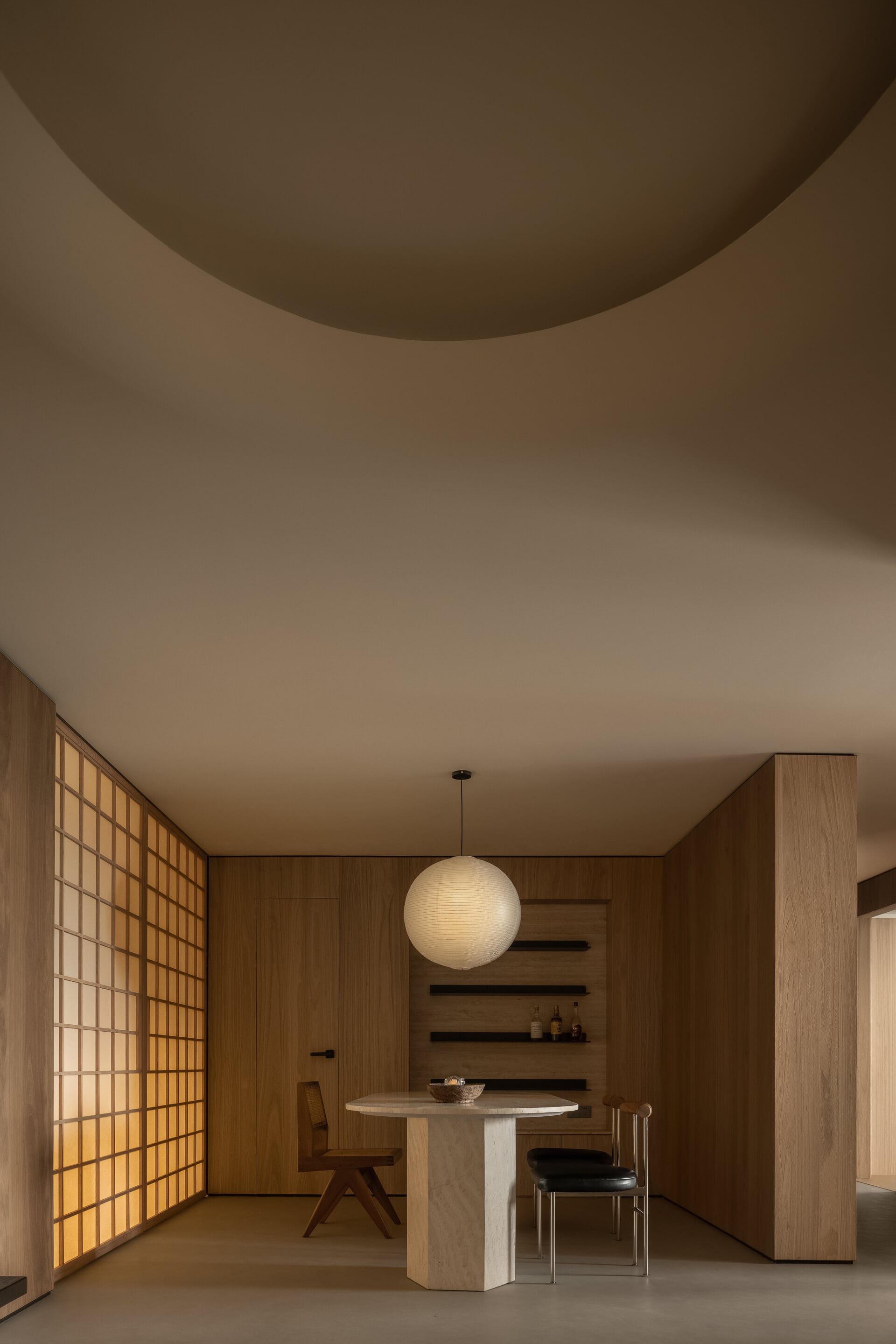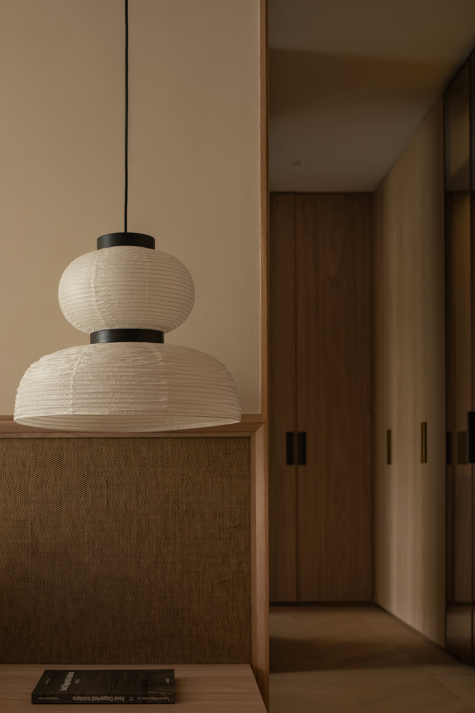 共享其变,私而守常。主人特别喜欢家人聚在一起的氛围,因此,设计师将空间公共活动区域最大限度地扩展与贯通。将主卧与两次卧分布于公区两端,保持独立与私密。木体纹用,圆顶、格栅木门、悬式纸灯等设计元素延续之。主卧设有隐藏式水吧台,为主人起夜与增进情感提供便利。侧开一窗,提供一种交互感与安全感。江流世事更迭,手枕岁月如昨。
