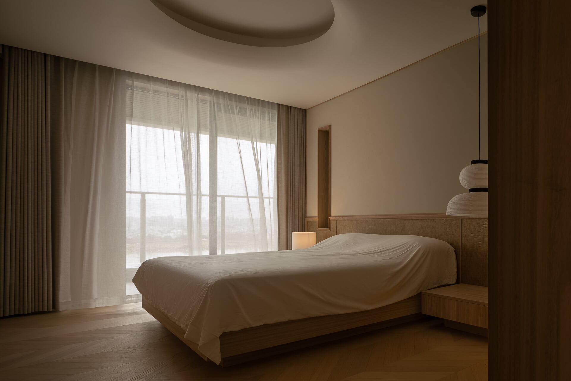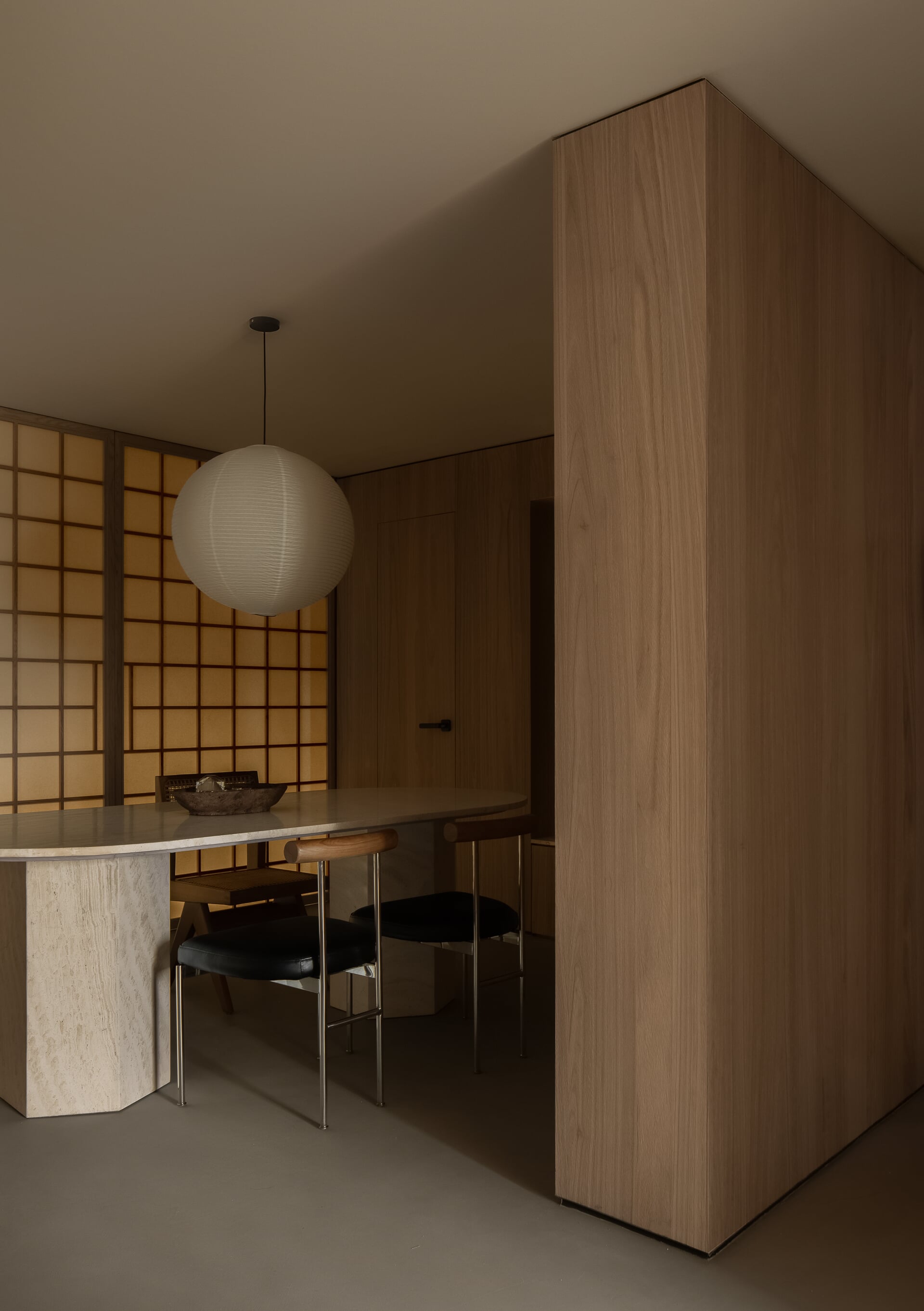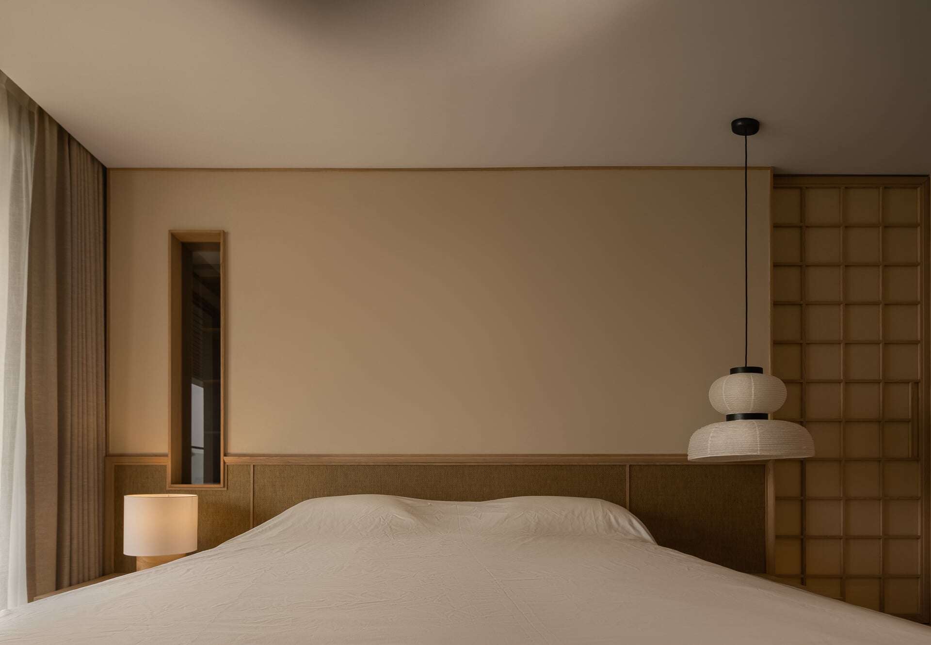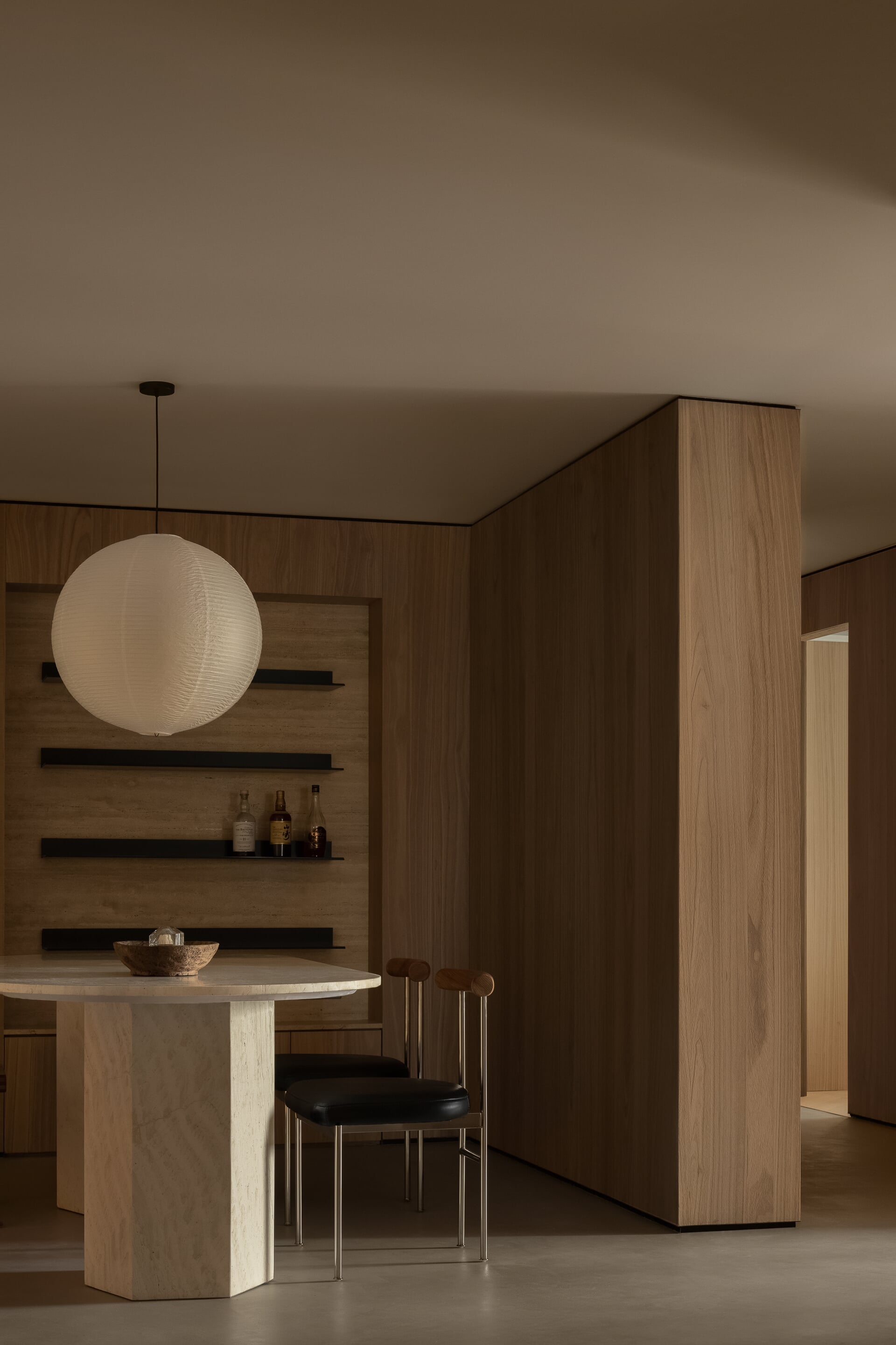共享其变,私而守常。主人特别喜欢家人聚在一起的氛围,因此,设计师将空间公共活动区域最大限度地扩展与贯通。将主卧与两次卧分布于公区两端,保持独立与私密。木体纹用,圆顶、格栅木门、悬式纸灯等设计元素延续之。主卧设有隐藏式水吧台,为主人起夜与增进情感提供便利。侧开一窗,提供一种交互感与安全感。江流世事更迭,手枕岁月如昨。