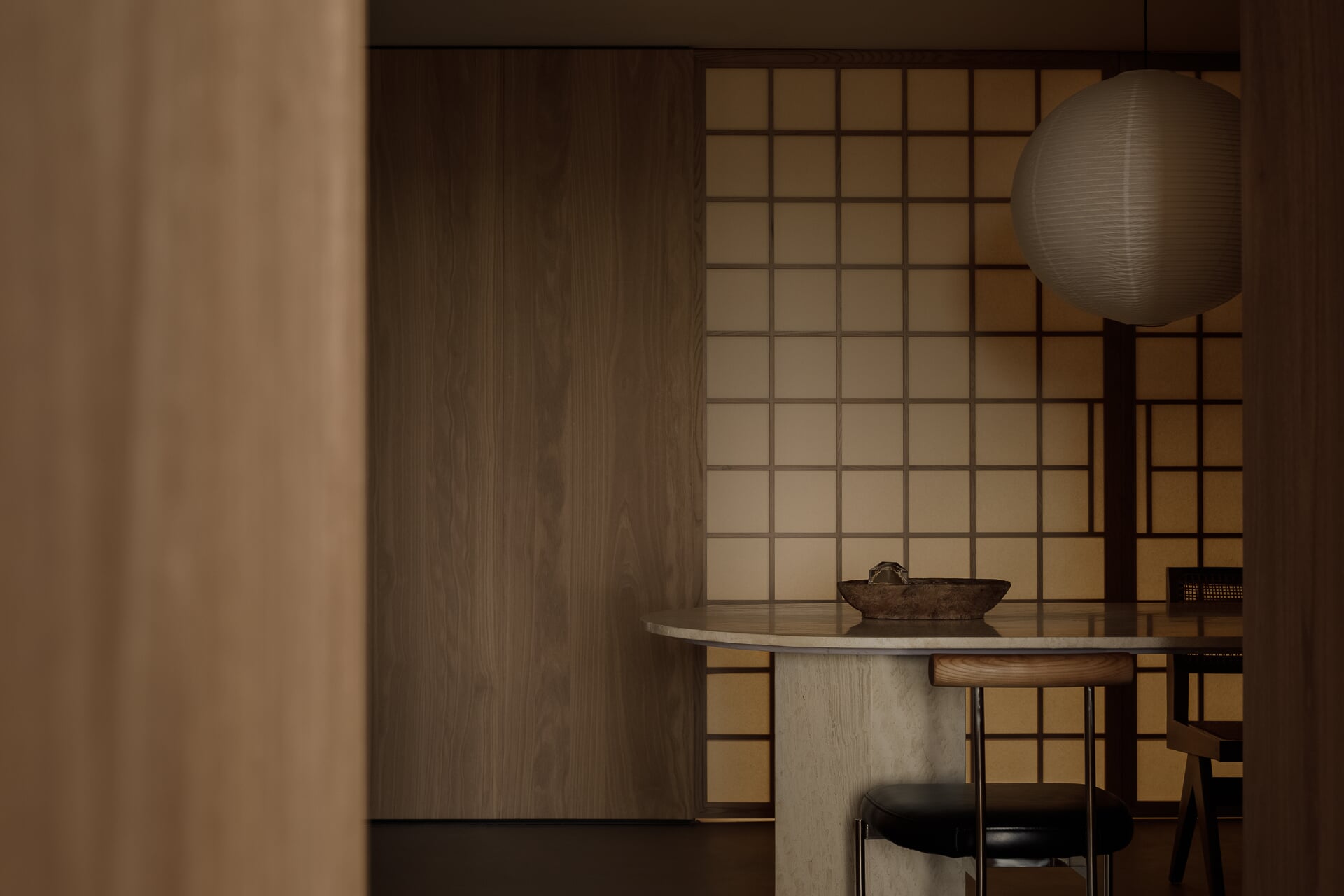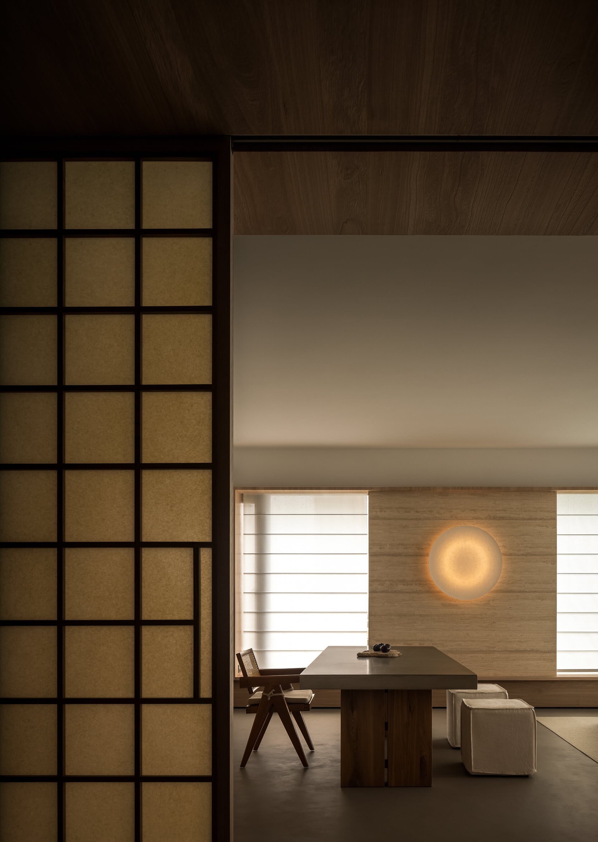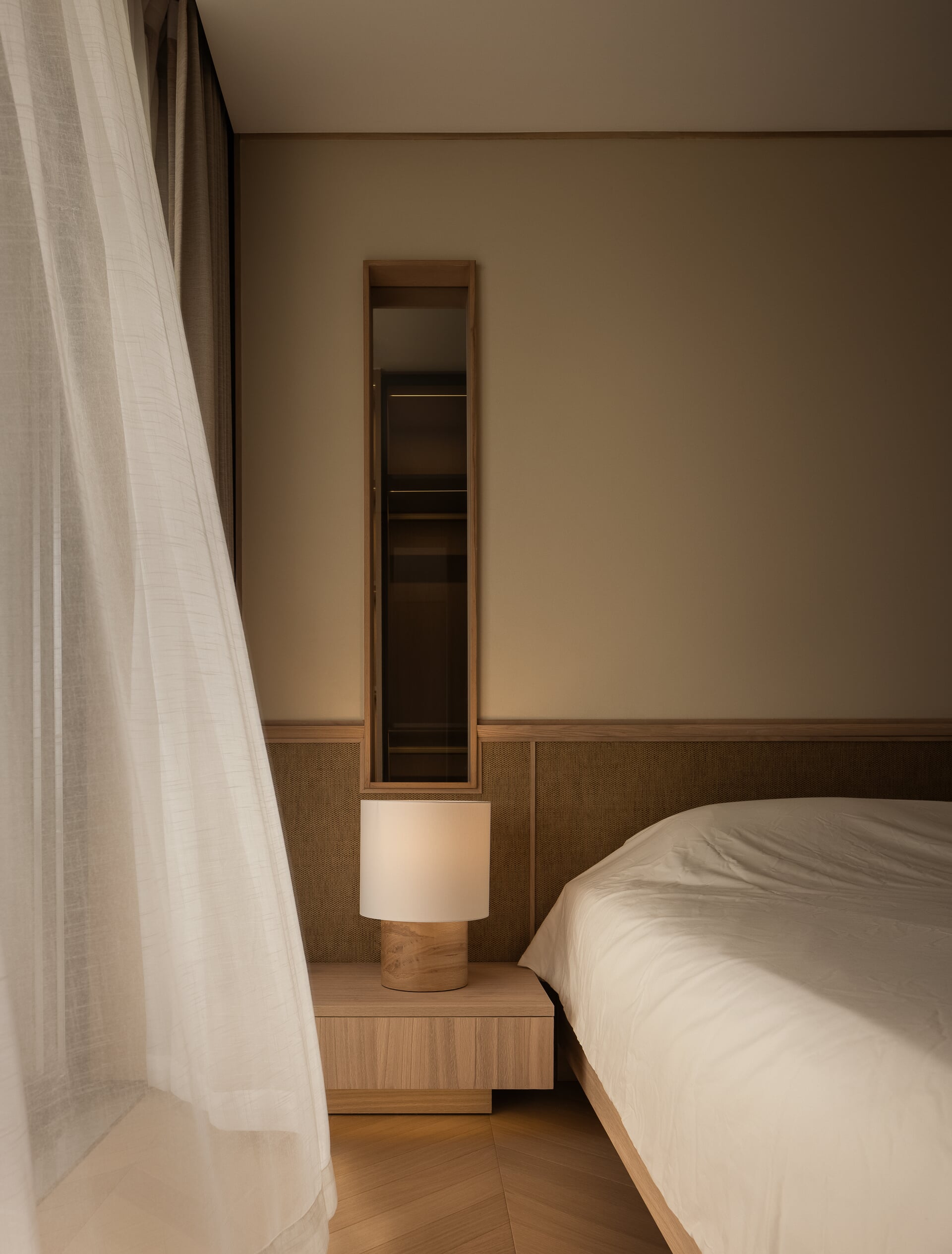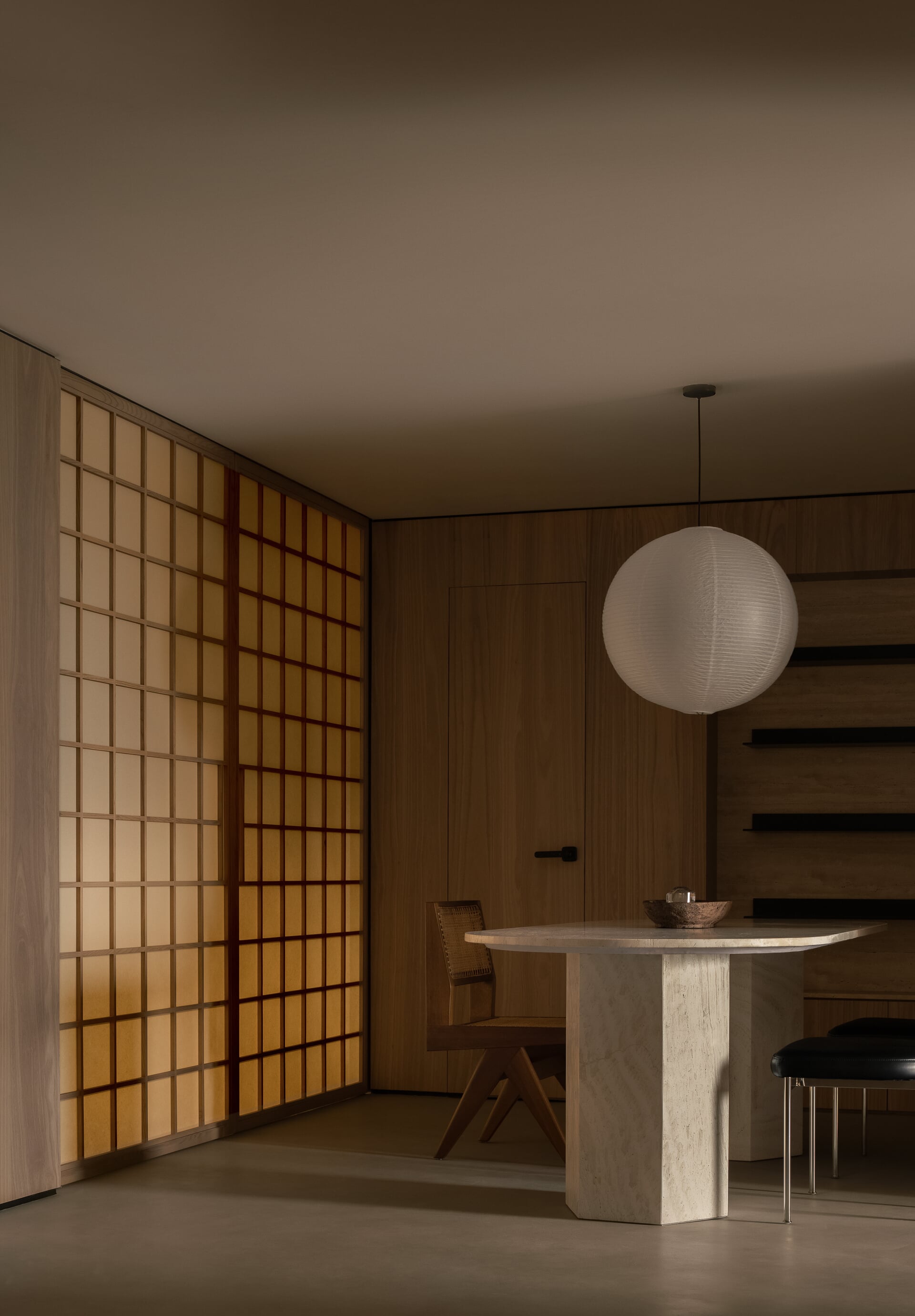 共享其变,私而守常。主人特别喜欢家人聚在一起的氛围,因此,设计师将空间公共活动区域最大限度地扩展与贯通。将主卧与两次卧分布于公区两端,保持独立与私密。木体纹用,圆顶、格栅木门、悬式纸灯等设计元素延续之。主卧设有隐藏式水吧台,为主人起夜与增进情感提供便利。侧开一窗,提供一种交互感与安全感。江流世事更迭,手枕岁月如昨。