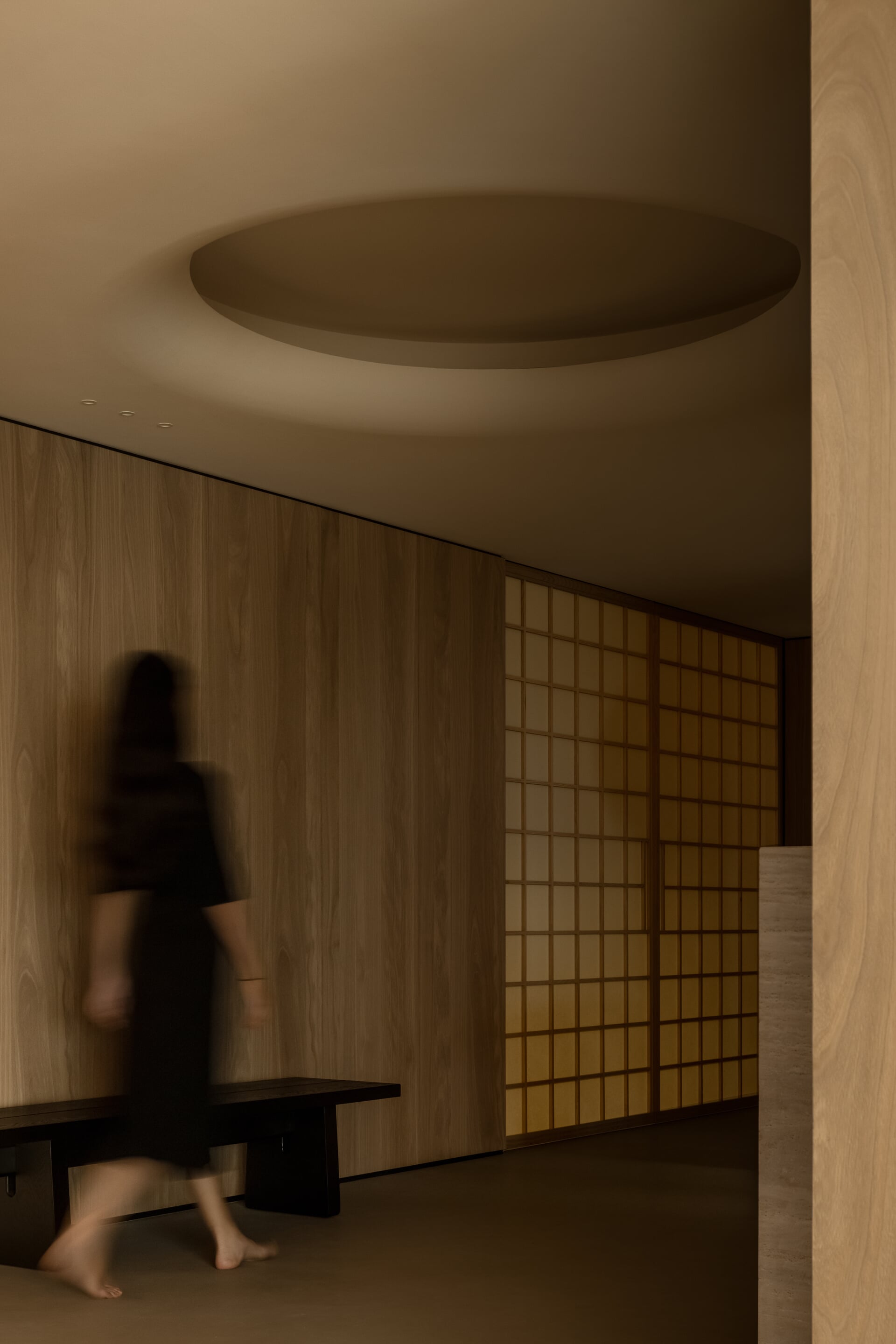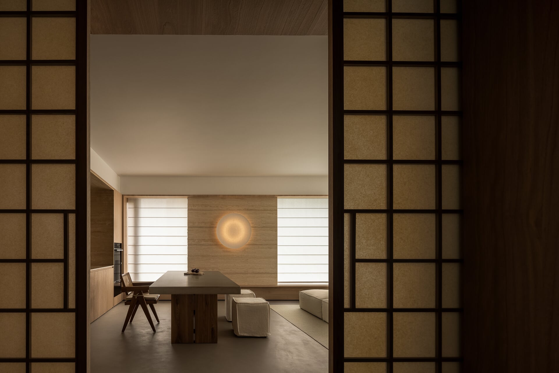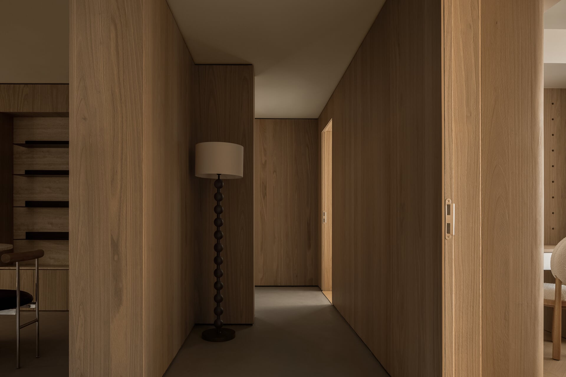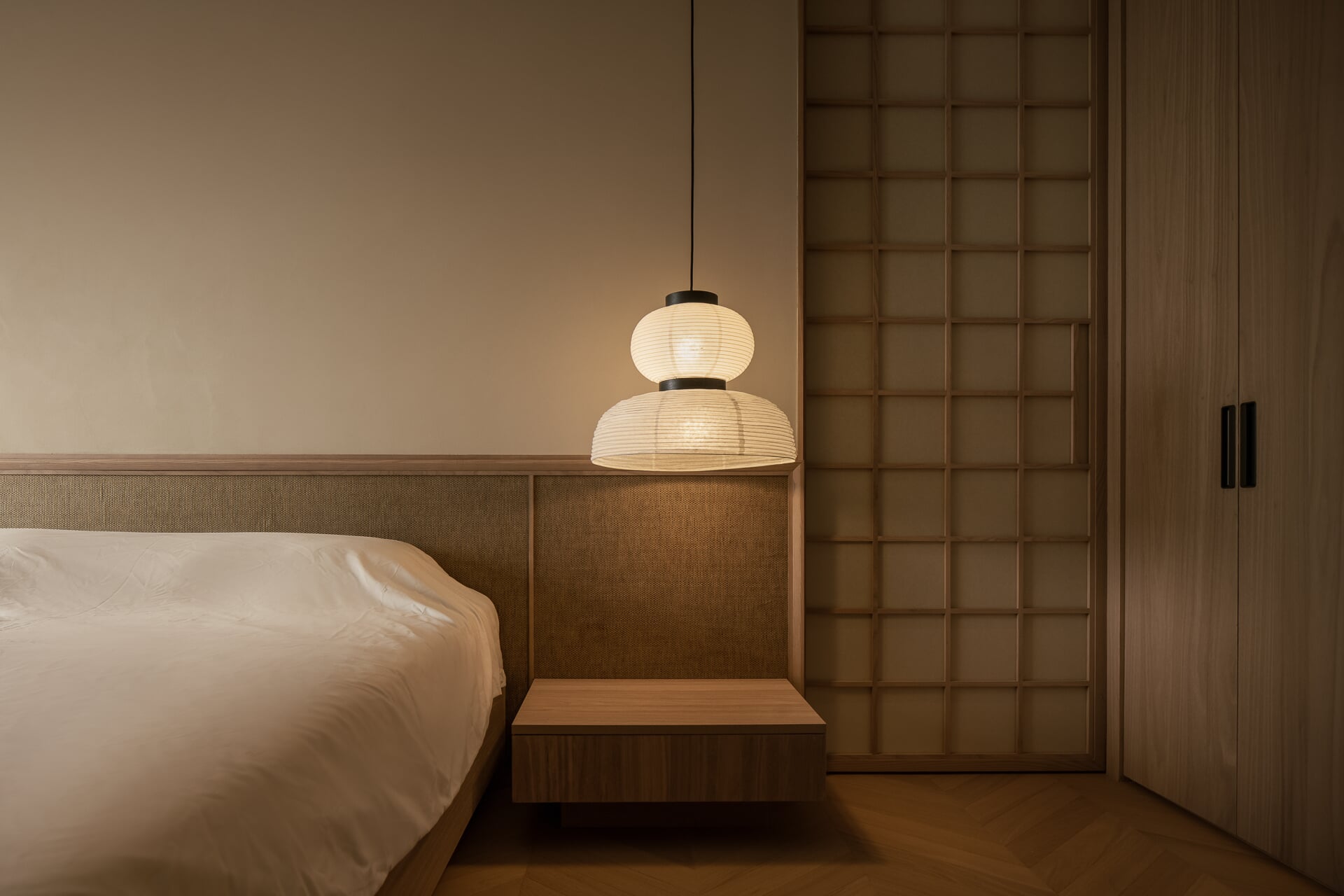 共享其变,私而守常。主人特别喜欢家人聚在一起的氛围,因此,设计师将空间公共活动区域最大限度地扩展与贯通。将主卧与两次卧分布于公区两端,保持独立与私密。木体纹用,圆顶、格栅木门、悬式纸灯等设计元素延续之。主卧设有隐藏式水吧台,为主人起夜与增进情感提供便利。侧开一窗,提供一种交互感与安全感。江流世事更迭,手枕岁月如昨。