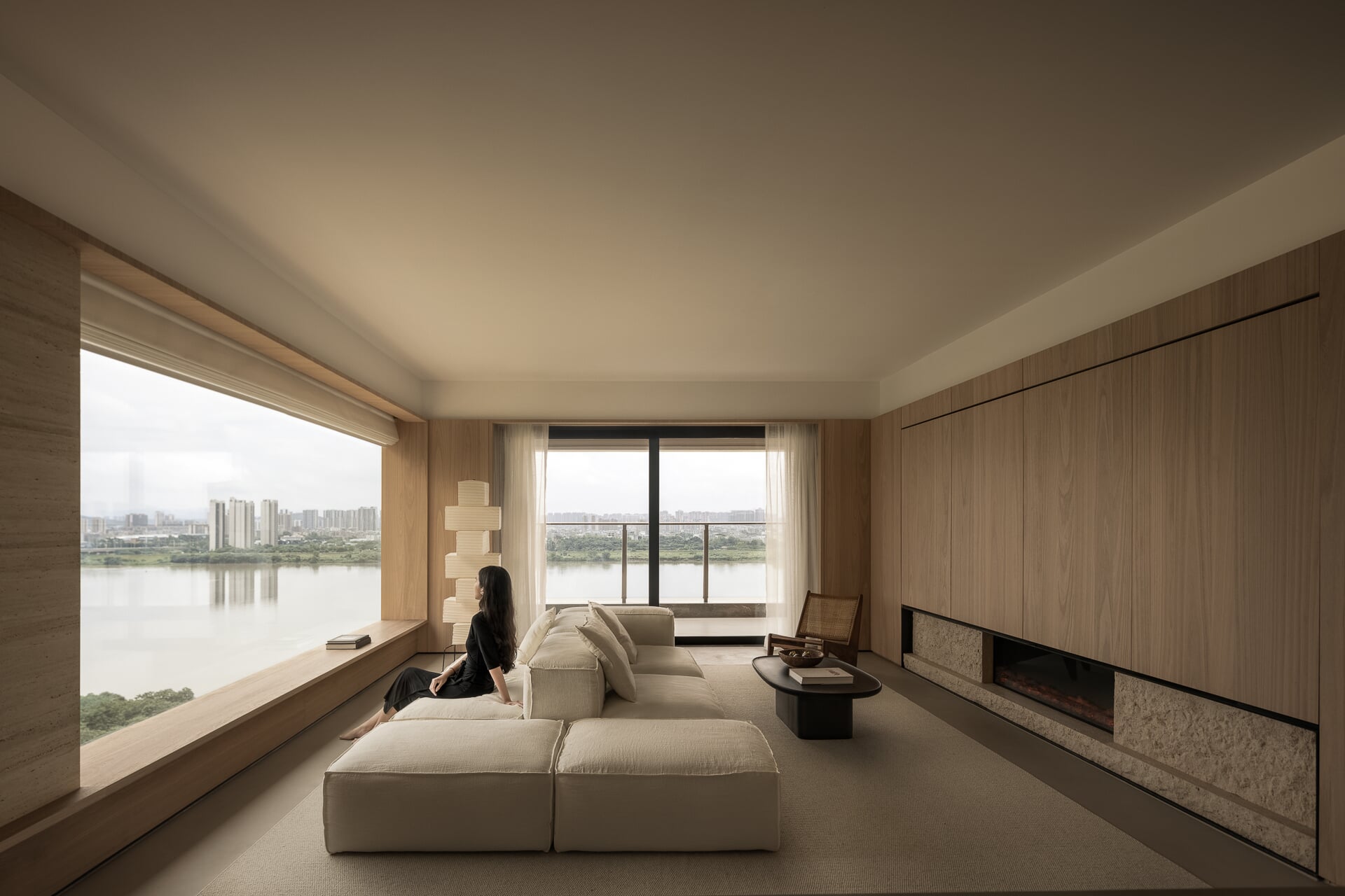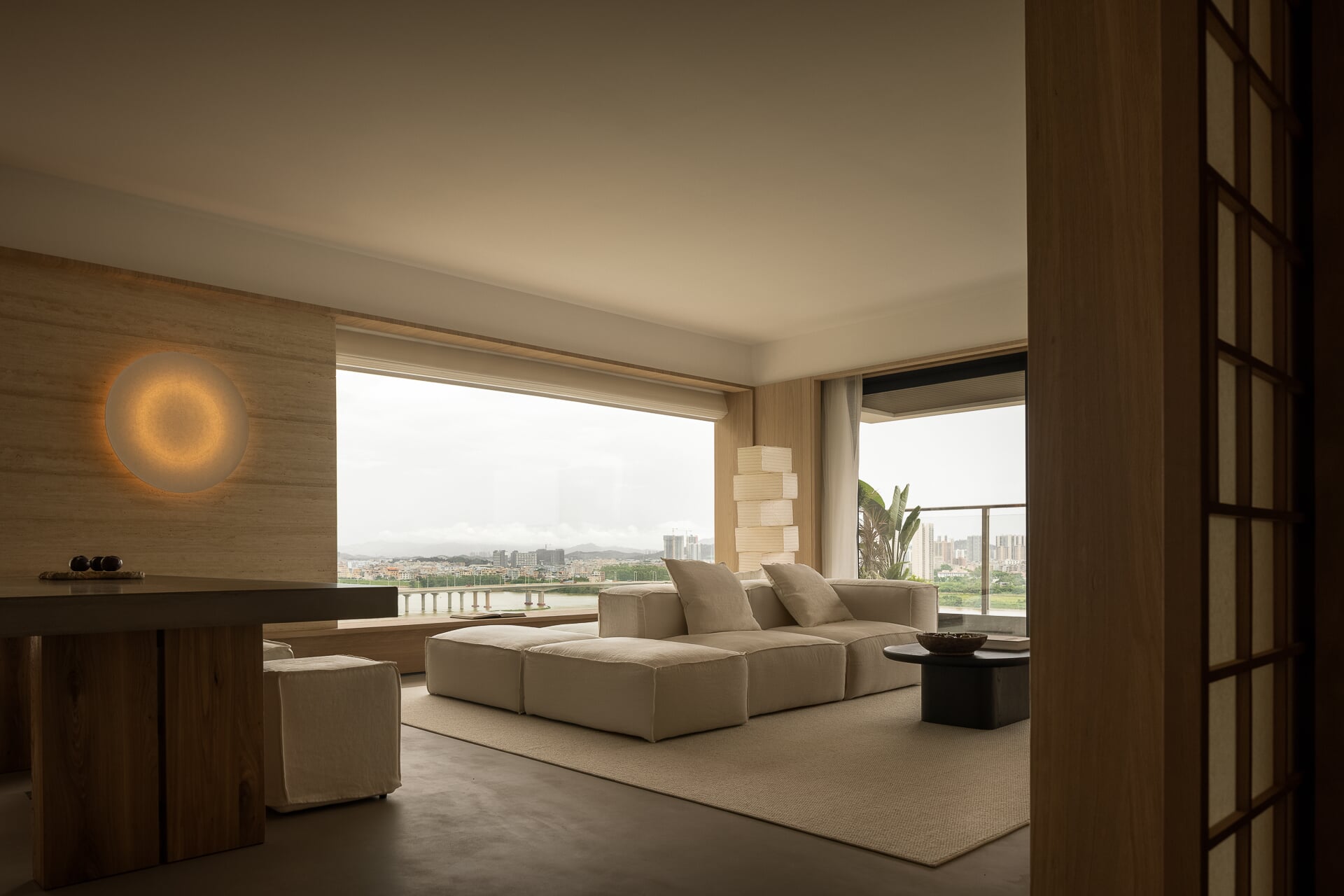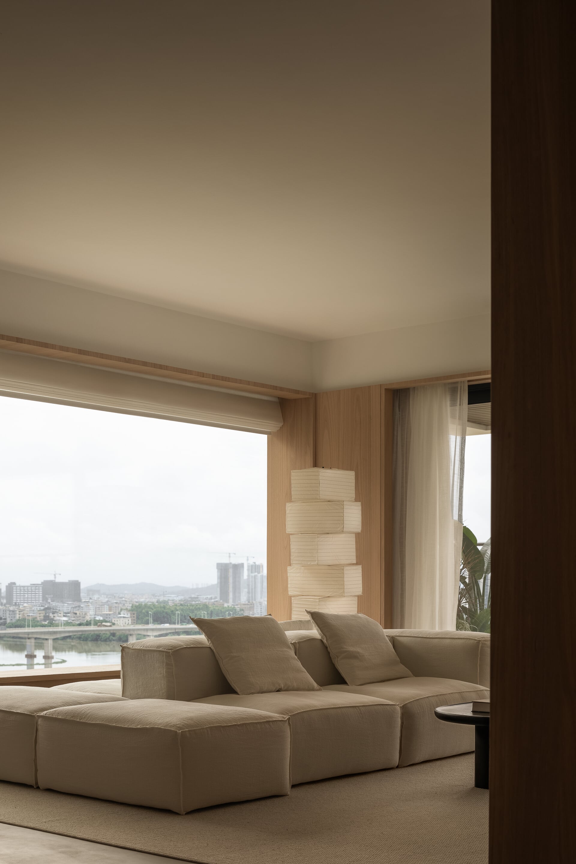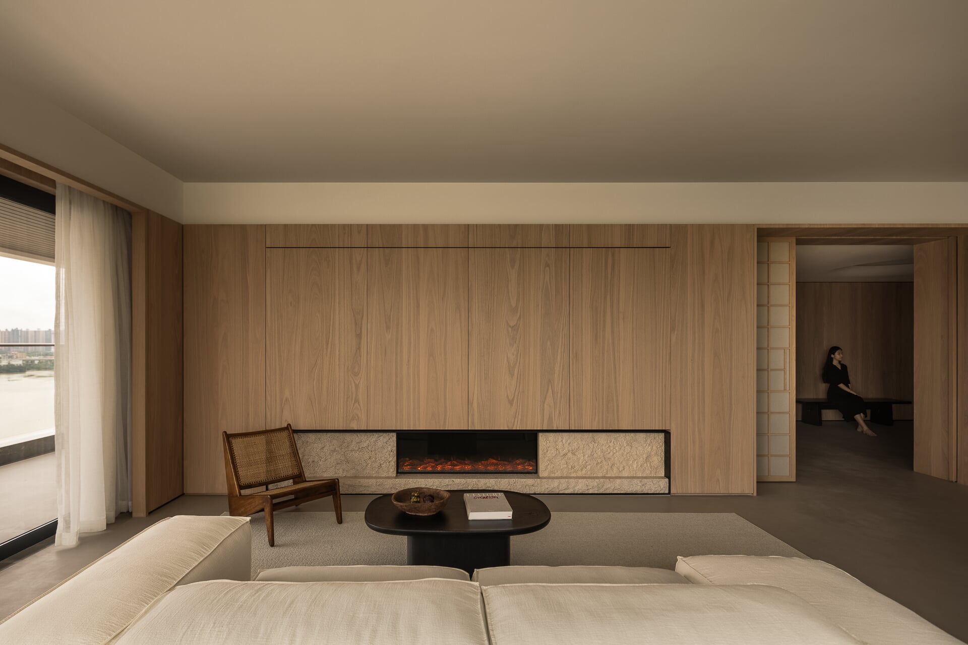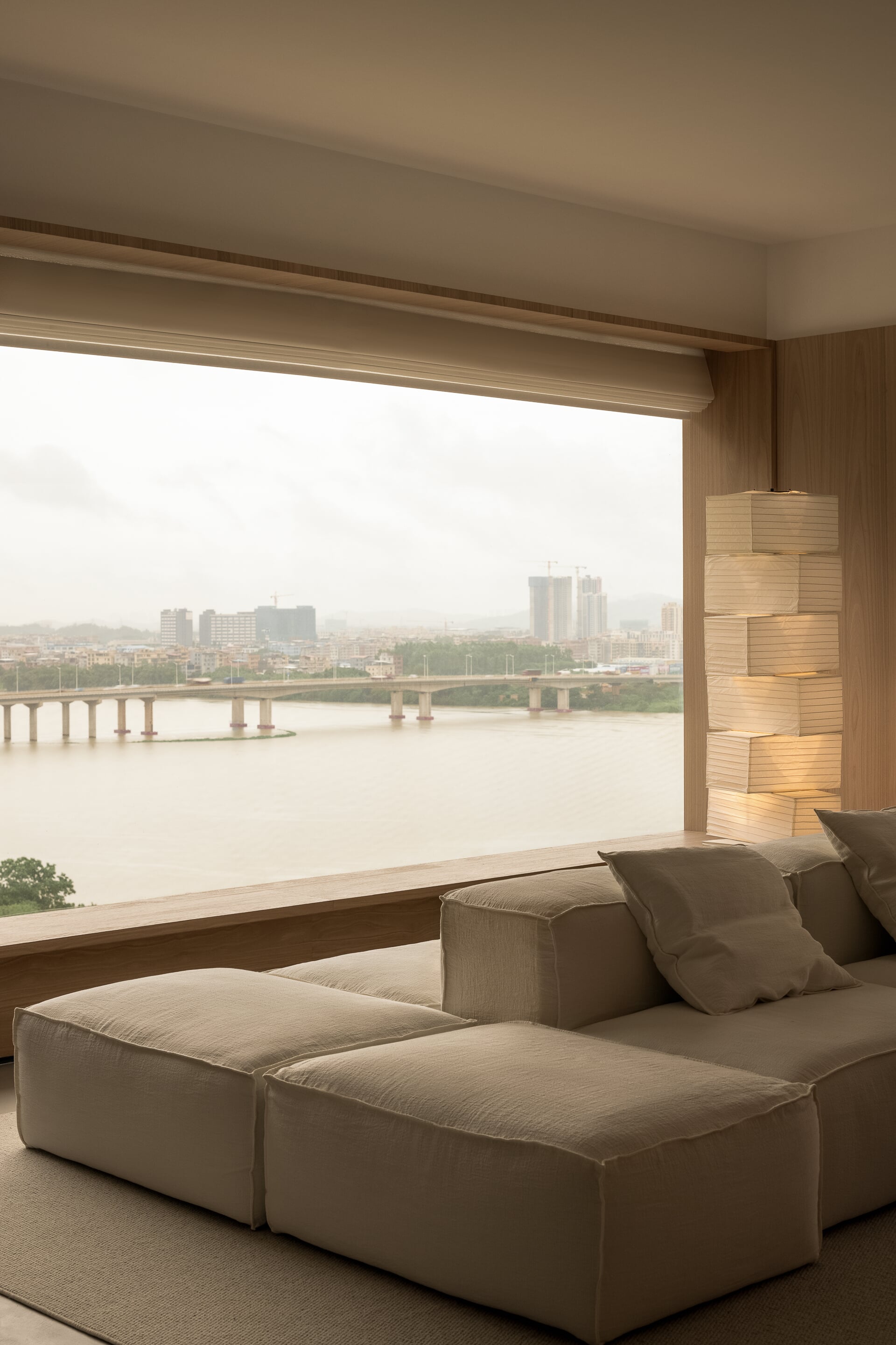 宽厚明阔,日暖风恬。格栅木门移开,一轮满月纸灯映入眼帘,奠定了整体空间的温和基调。客厅视野宽阔,设西厨与品茗区,以供主人待客、简食、攀谈之用。设计师选用双向布面沙发一组,配搭木几一方、木椅一张,临窗纸灯一盏,呼应柜体石间壁炉,宽厚而轻盈、质实而温和。电视被隐藏起来以降低对孩子们的心理暗示;男主人兴致盎然时,一家人可面江而坐,共享一场时光弹唱会。窗外江河有水,室内栖木有根,心间温润,归复自然。