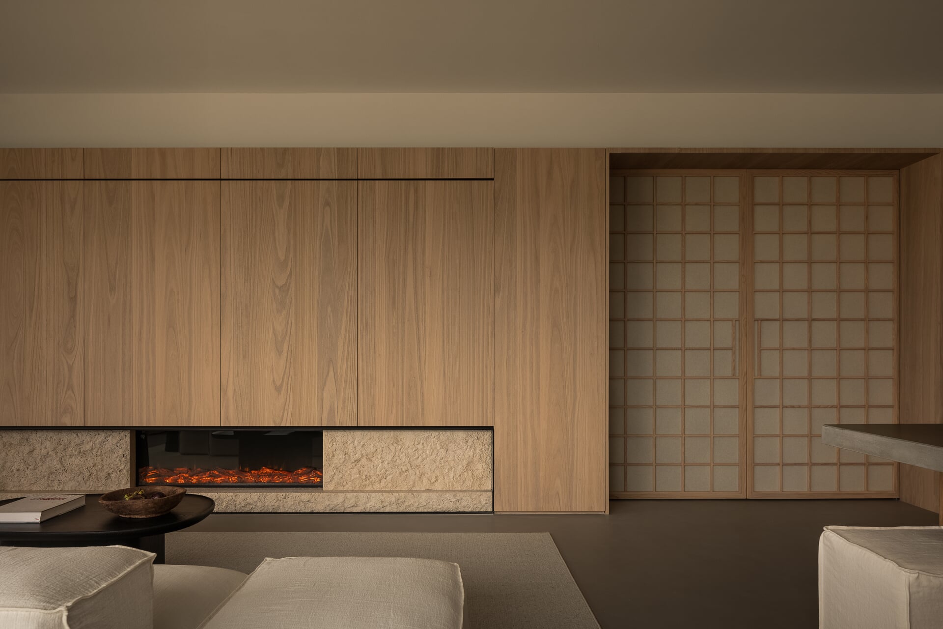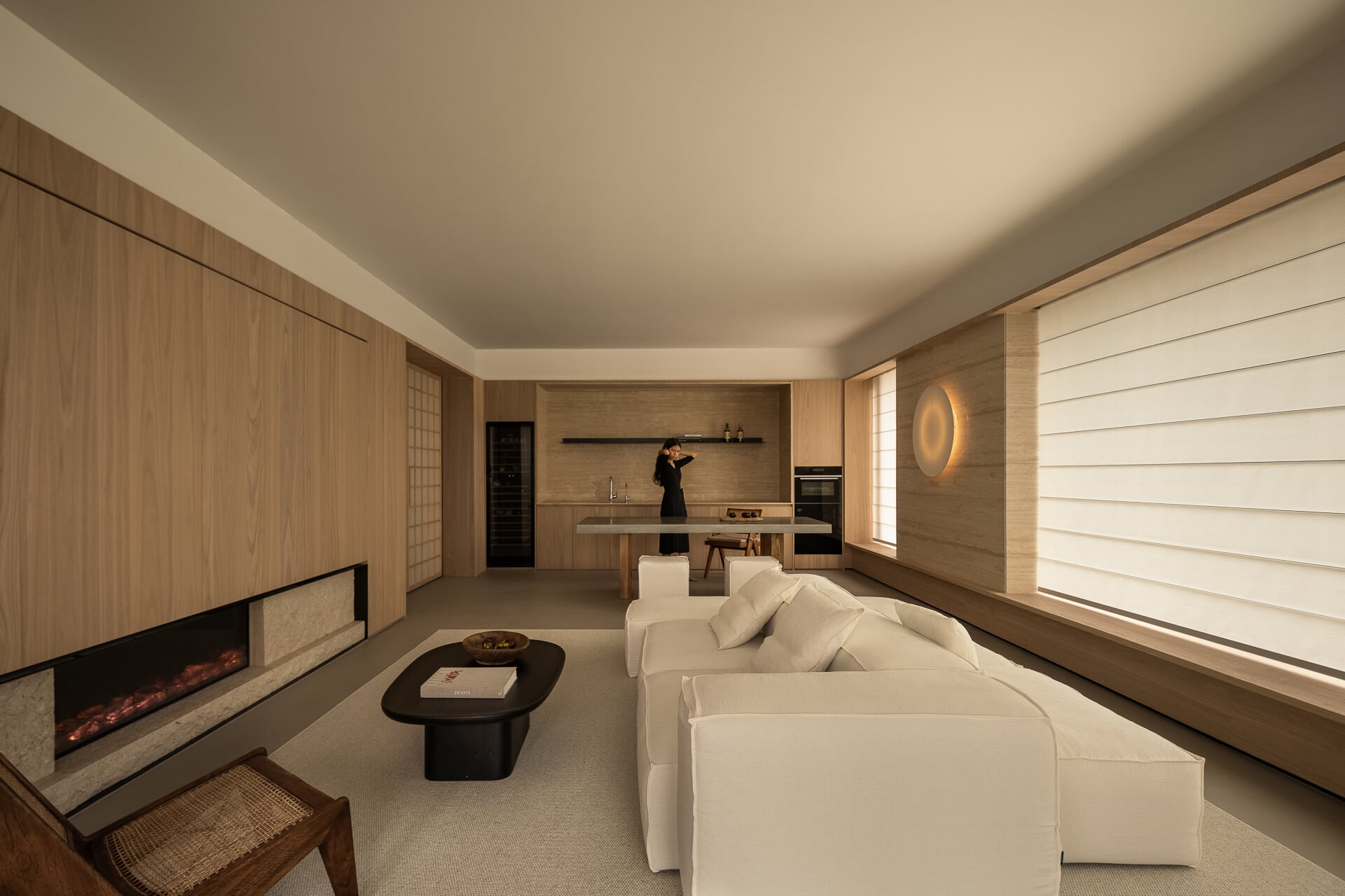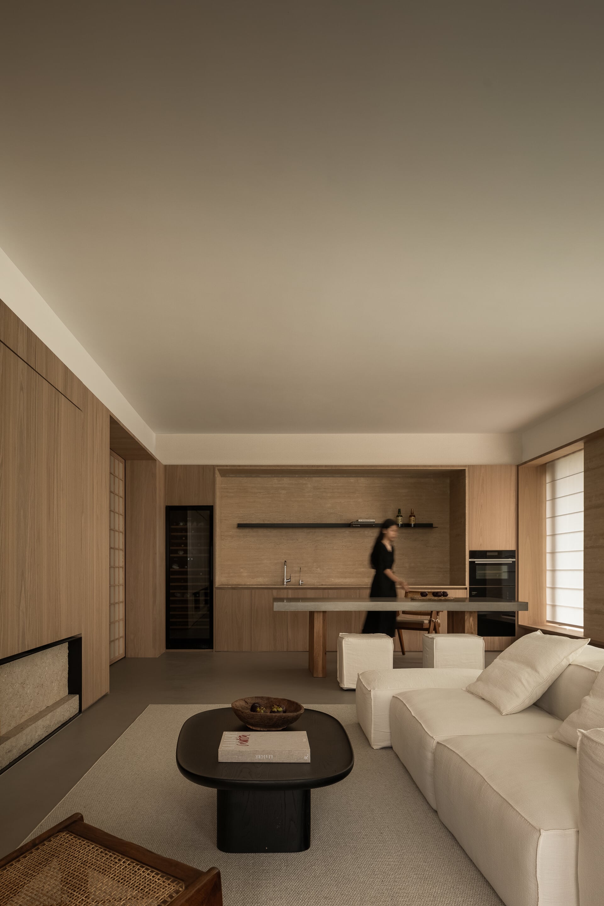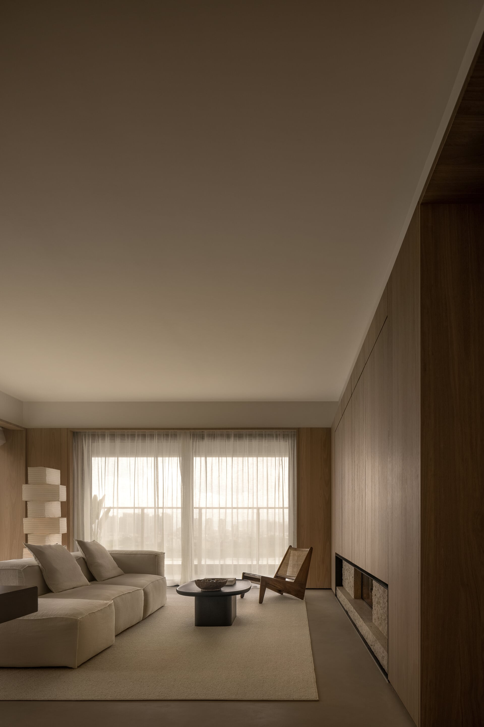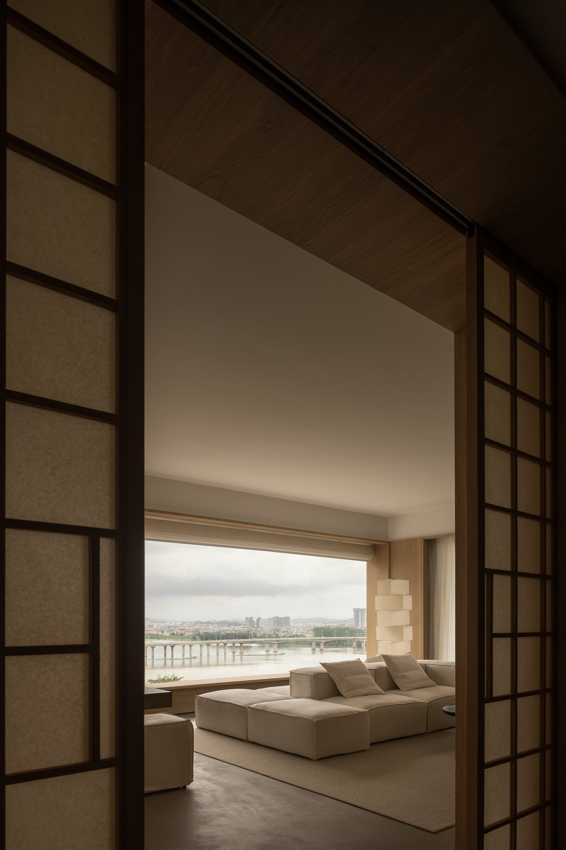 宽厚明阔,日暖风恬。格栅木门移开,一轮满月纸灯映入眼帘,奠定了整体空间的温和基调。客厅视野宽阔,设西厨与品茗区,以供主人待客、简食、攀谈之用。设计师选用双向布面沙发一组,配搭木几一方、木椅一张,临窗纸灯一盏,呼应柜体石间壁炉,宽厚而轻盈、质实而温和。电视被隐藏起来以降低对孩子们的心理暗示;男主人兴致盎然时,一家人可面江而坐,共享一场时光弹唱会。窗外江河有水,室内栖木有根,心间温润,归复自然。