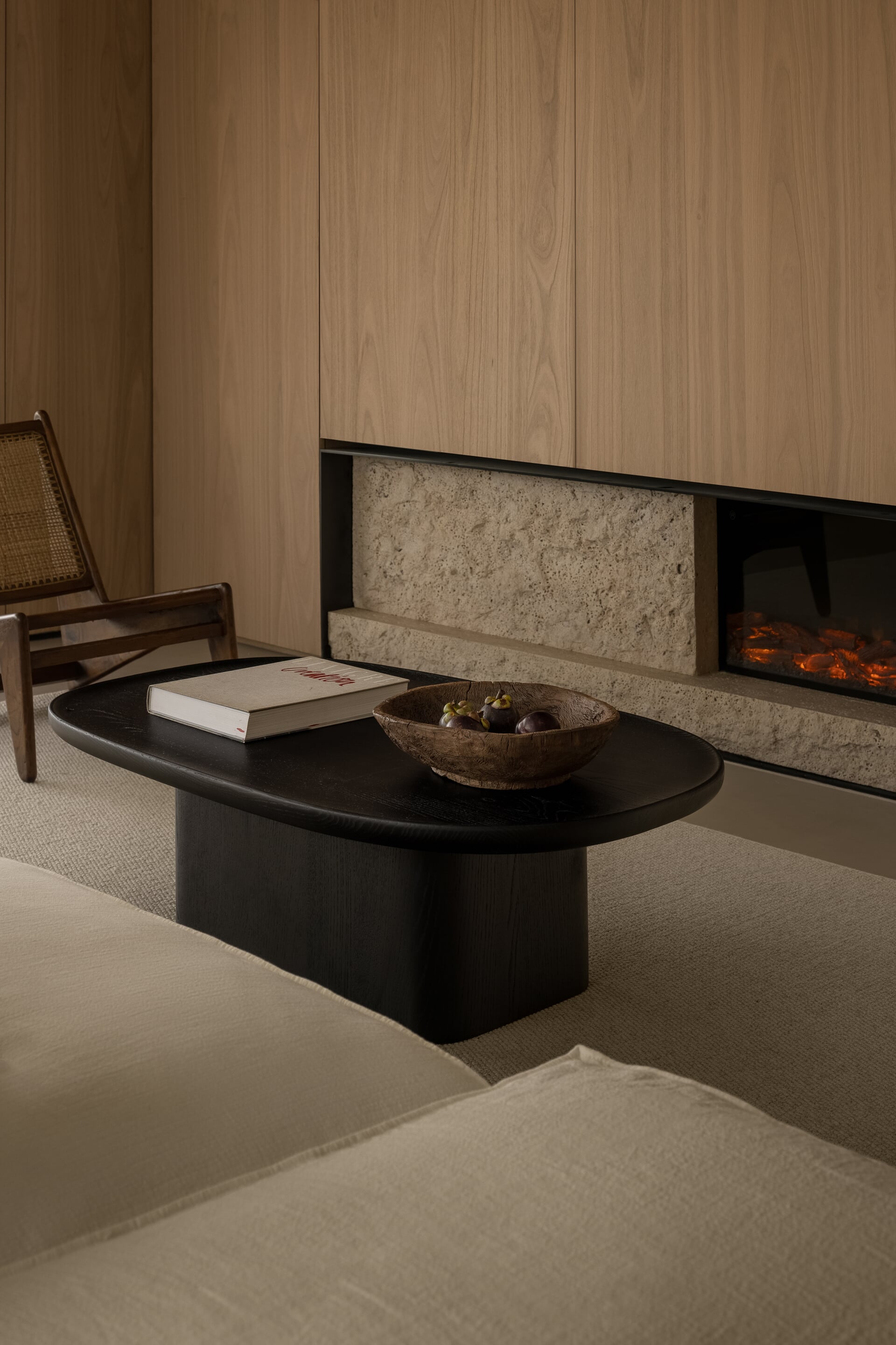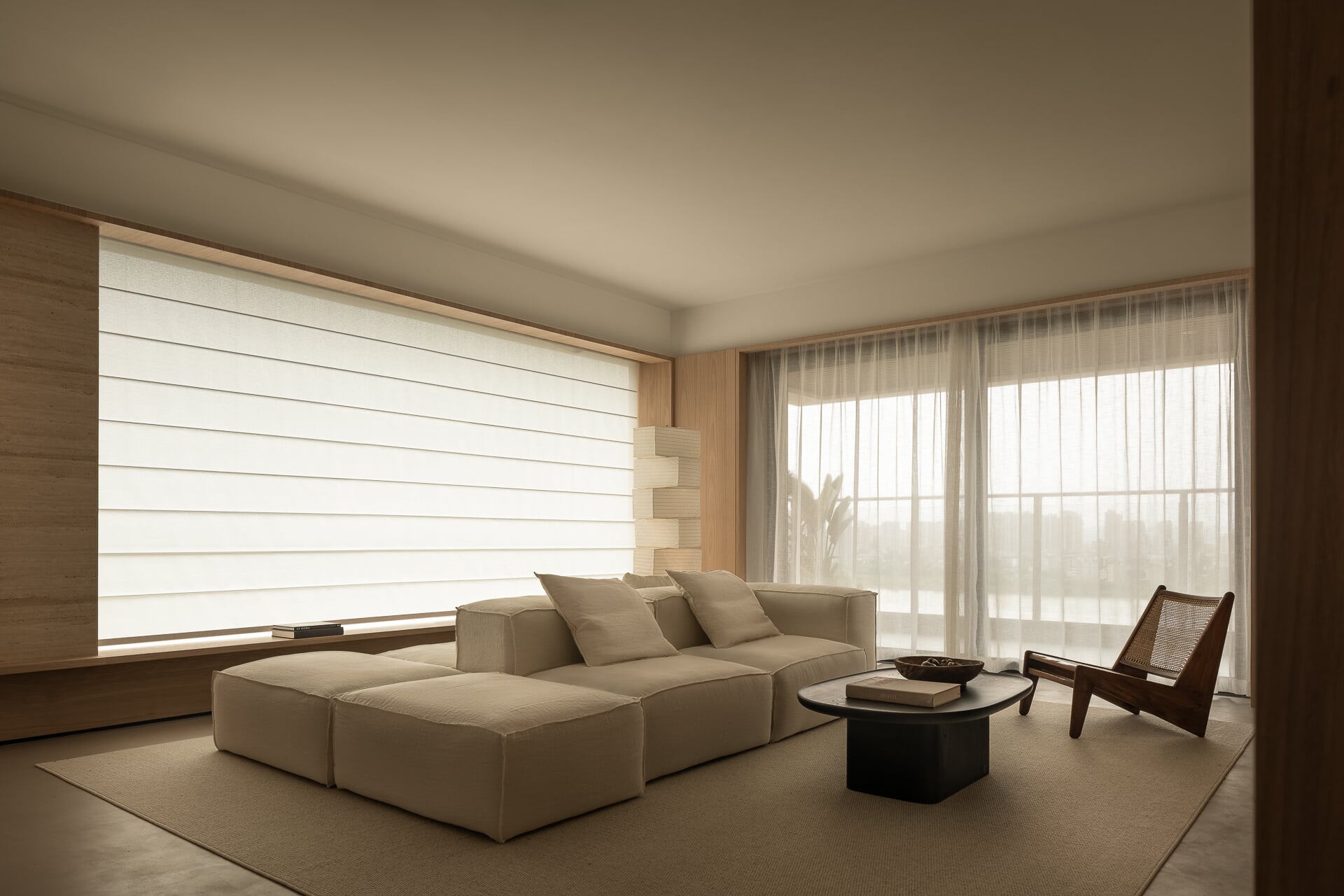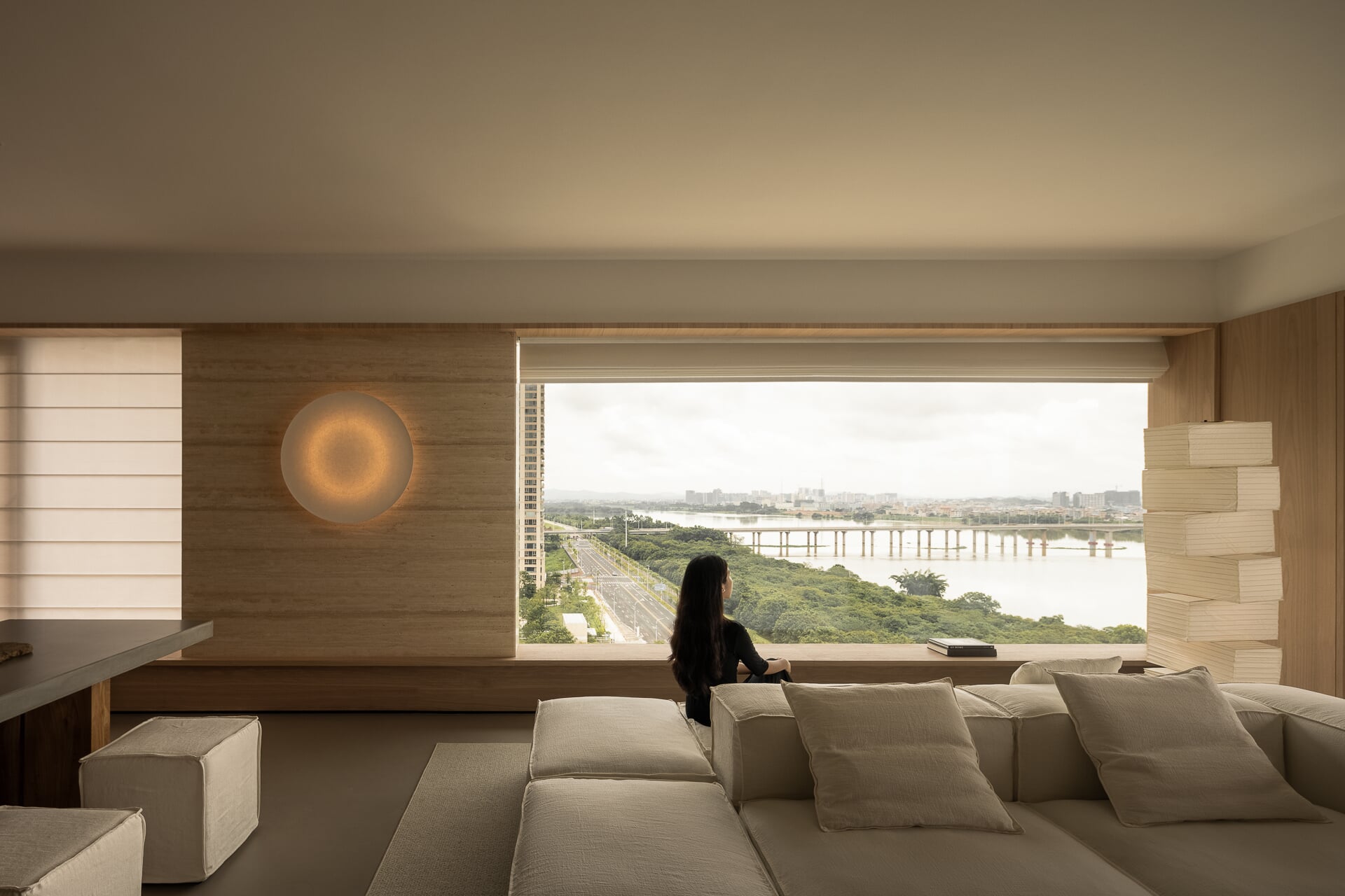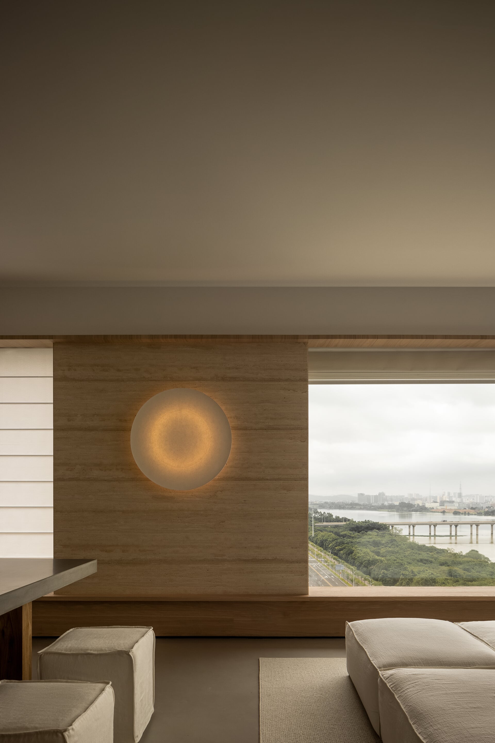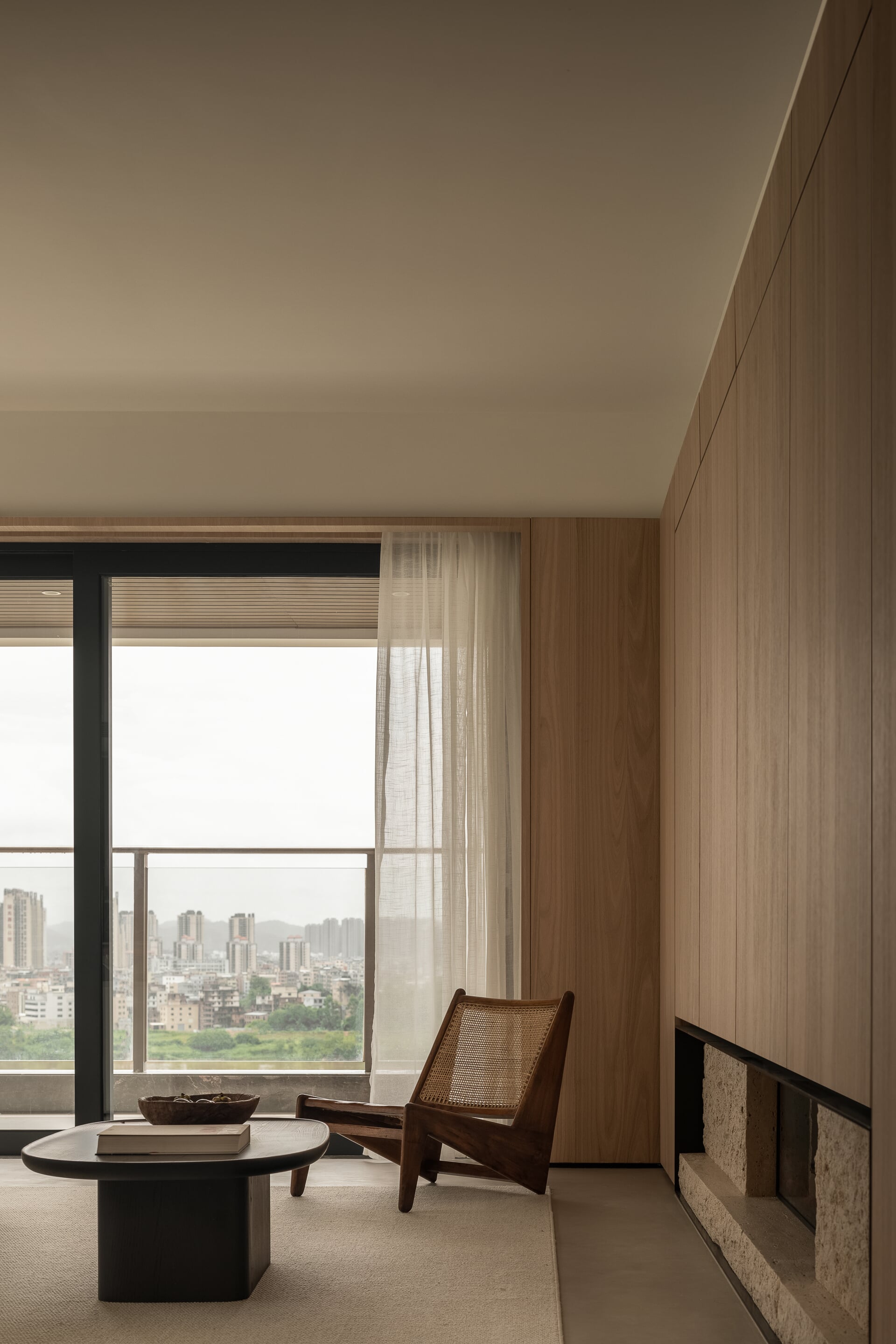 宽厚明阔,日暖风恬。格栅木门移开,一轮满月纸灯映入眼帘,奠定了整体空间的温和基调。客厅视野宽阔,设西厨与品茗区,以供主人待客、简食、攀谈之用。设计师选用双向布面沙发一组,配搭木几一方、木椅一张,临窗纸灯一盏,呼应柜体石间壁炉,宽厚而轻盈、质实而温和。电视被隐藏起来以降低对孩子们的心理暗示;男主人兴致盎然时,一家人可面江而坐,共享一场时光弹唱会。窗外江河有水,室内栖木有根,心间温润,归复自然。