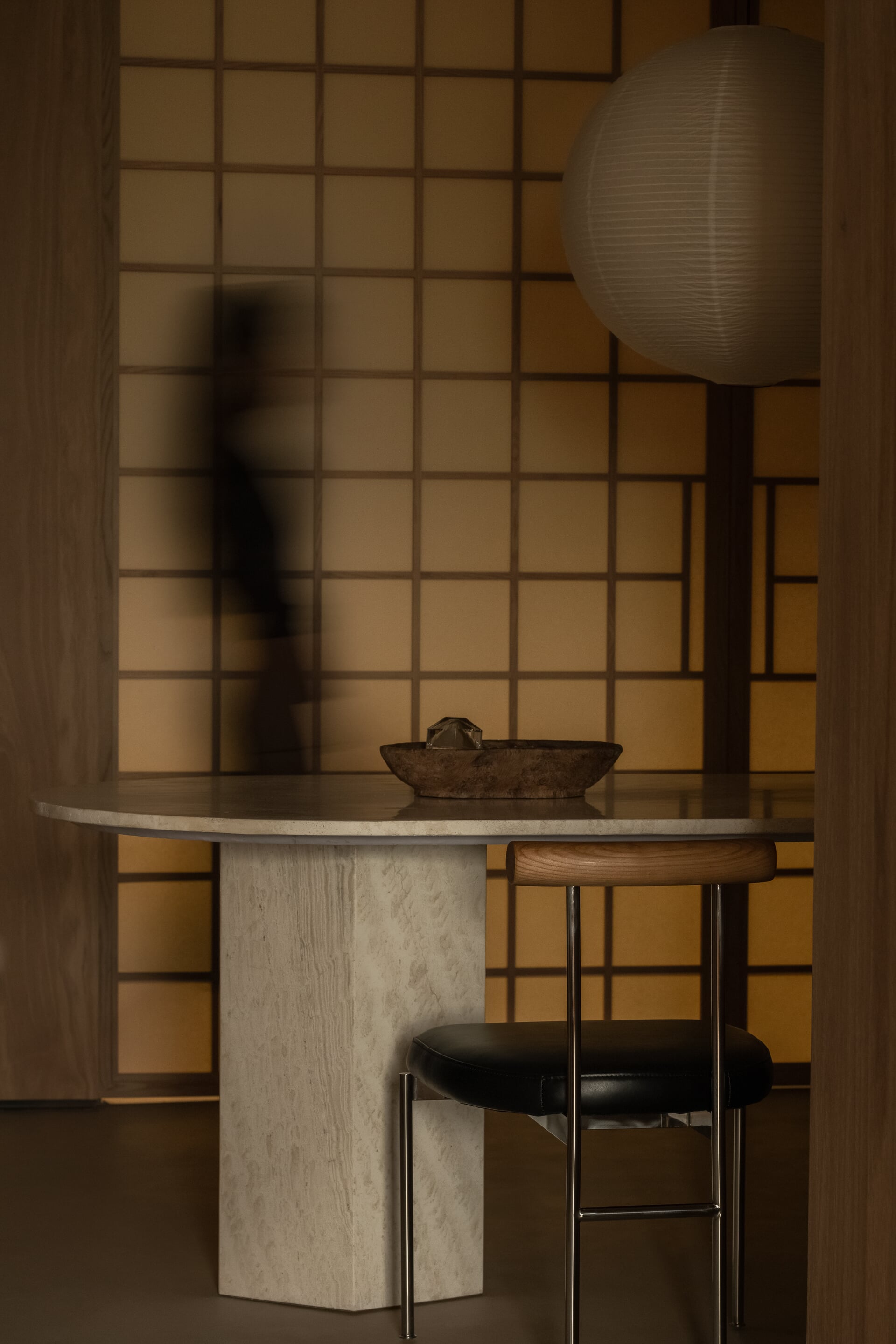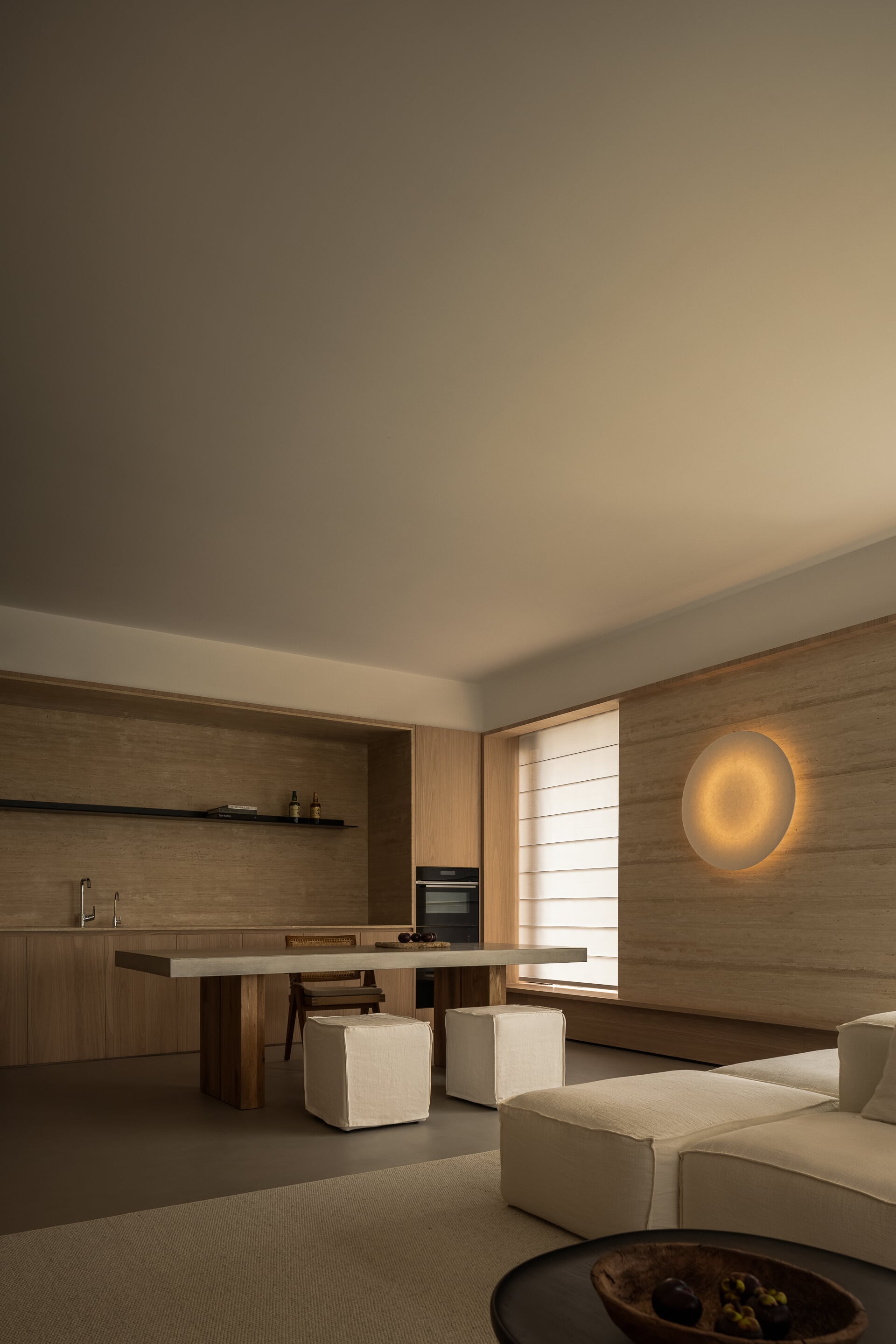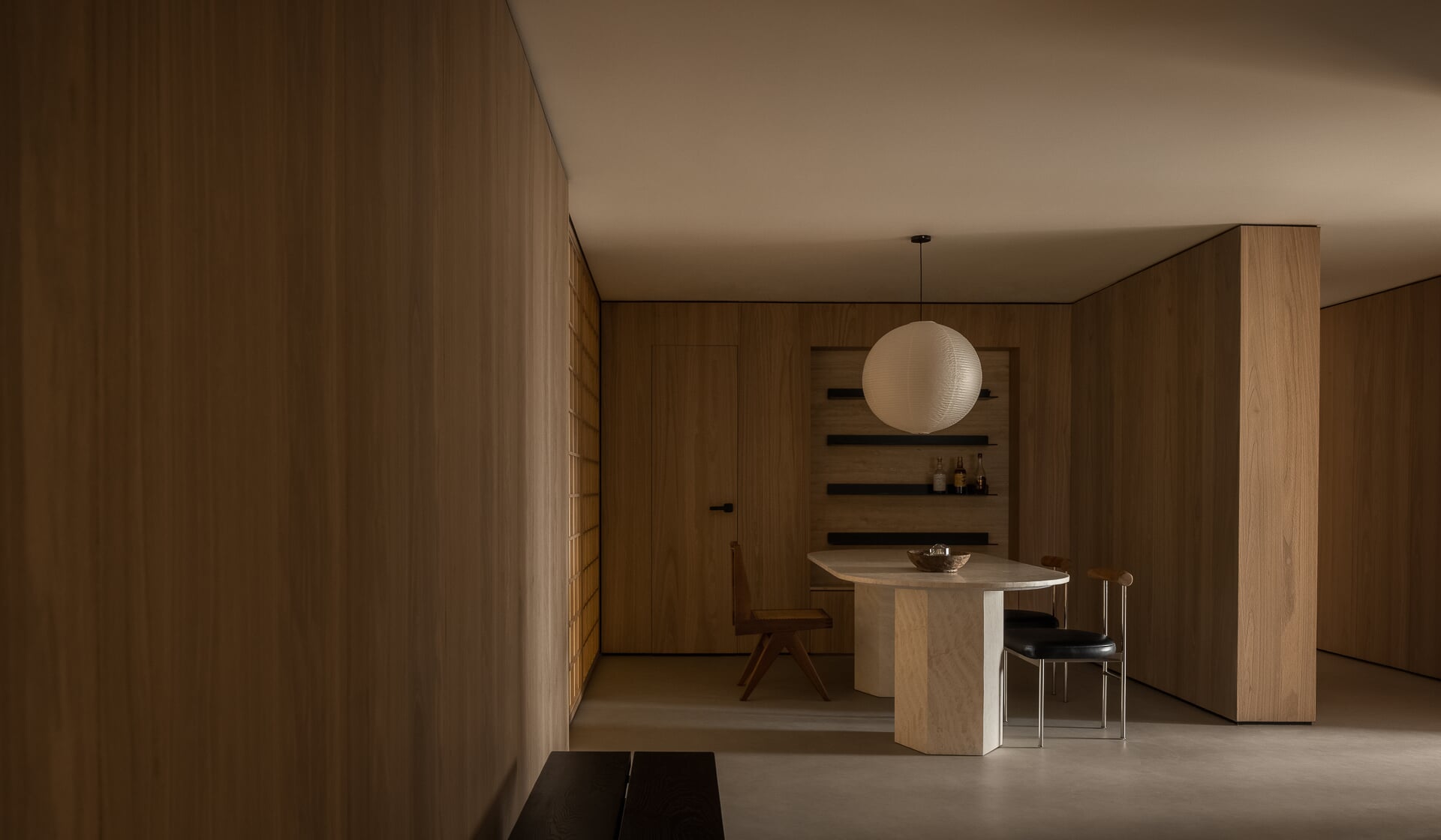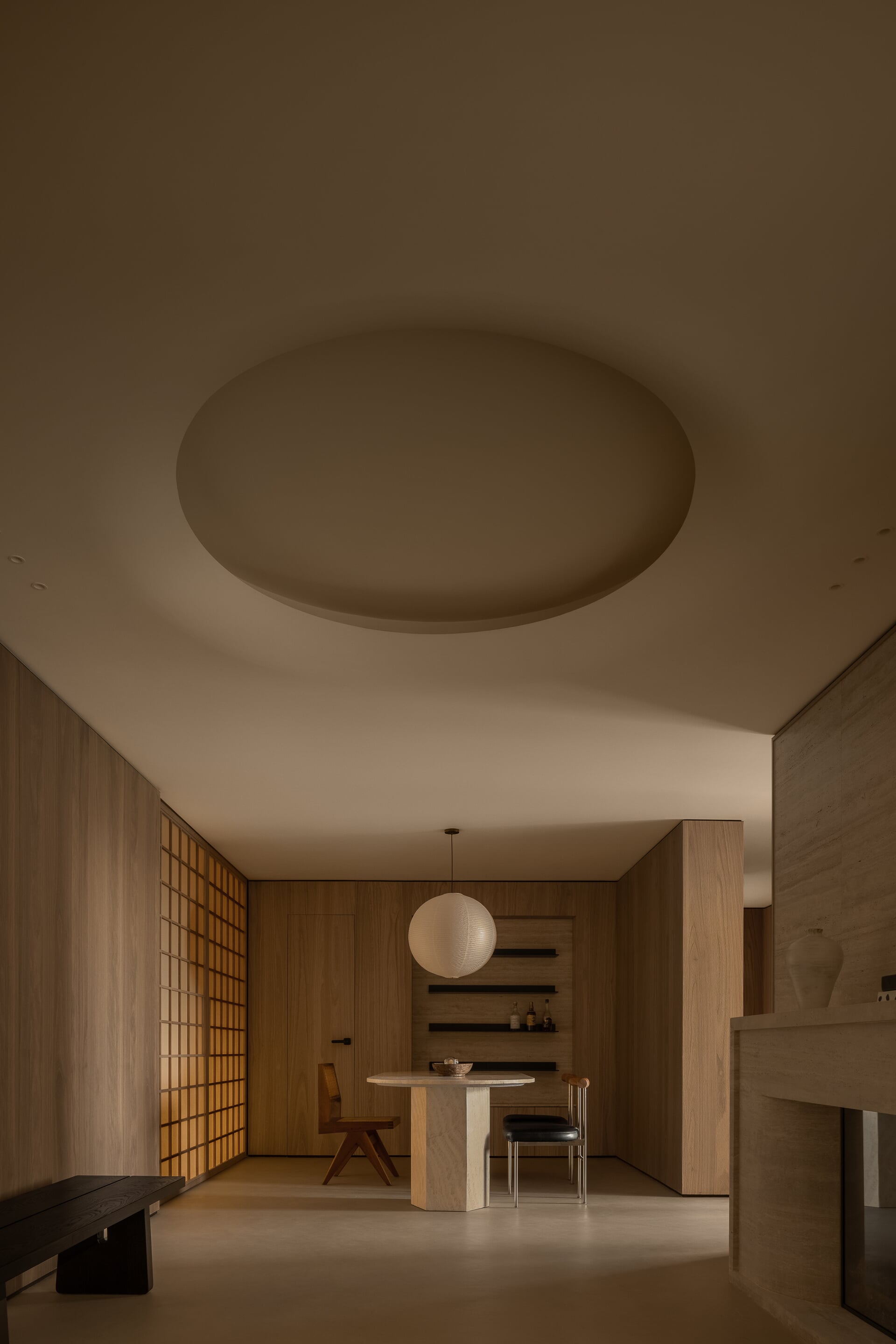 藏而通达,隐有乾坤。从玄关进入前厅,是一个聚合与流转区:暗色木质条凳与浅色石纹壁炉形成与餐厅融合的第二玄关,新风与照明功能隐于天花圆顶之中,开合之间自由联通厨房、客厅、卧室。动静虚实,思深言浅,以至平和。